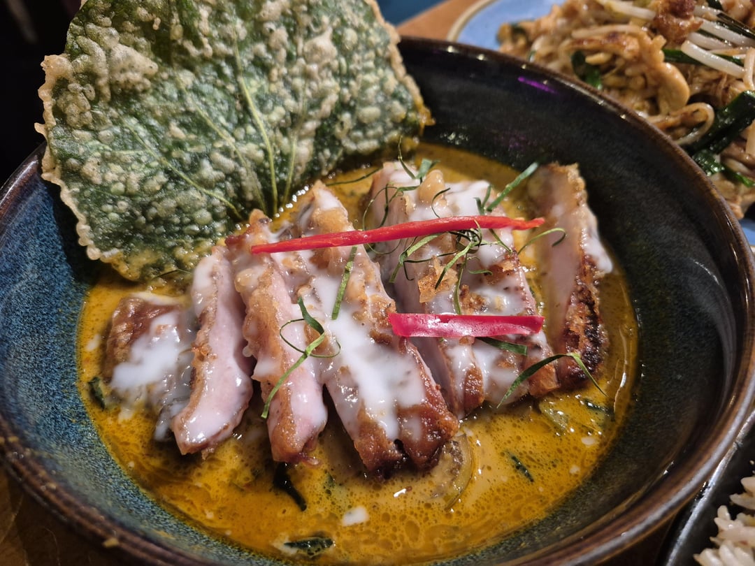 Kor Moo Gaeng Kua (Coconut curry with pork jowl, Thai acacia, baby eggplant, betel leaves)