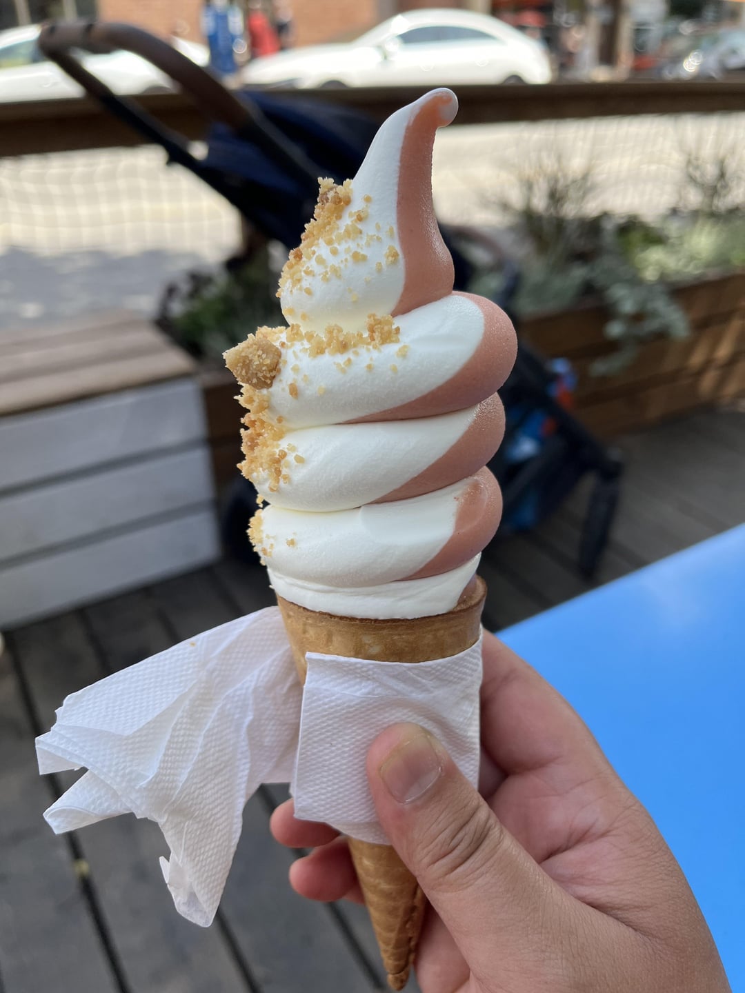 Vanilla and strawberry/rhubarb swirl soft serve at Virevent, Montréal, QC.by Sindtwhistle Dining and Cooking