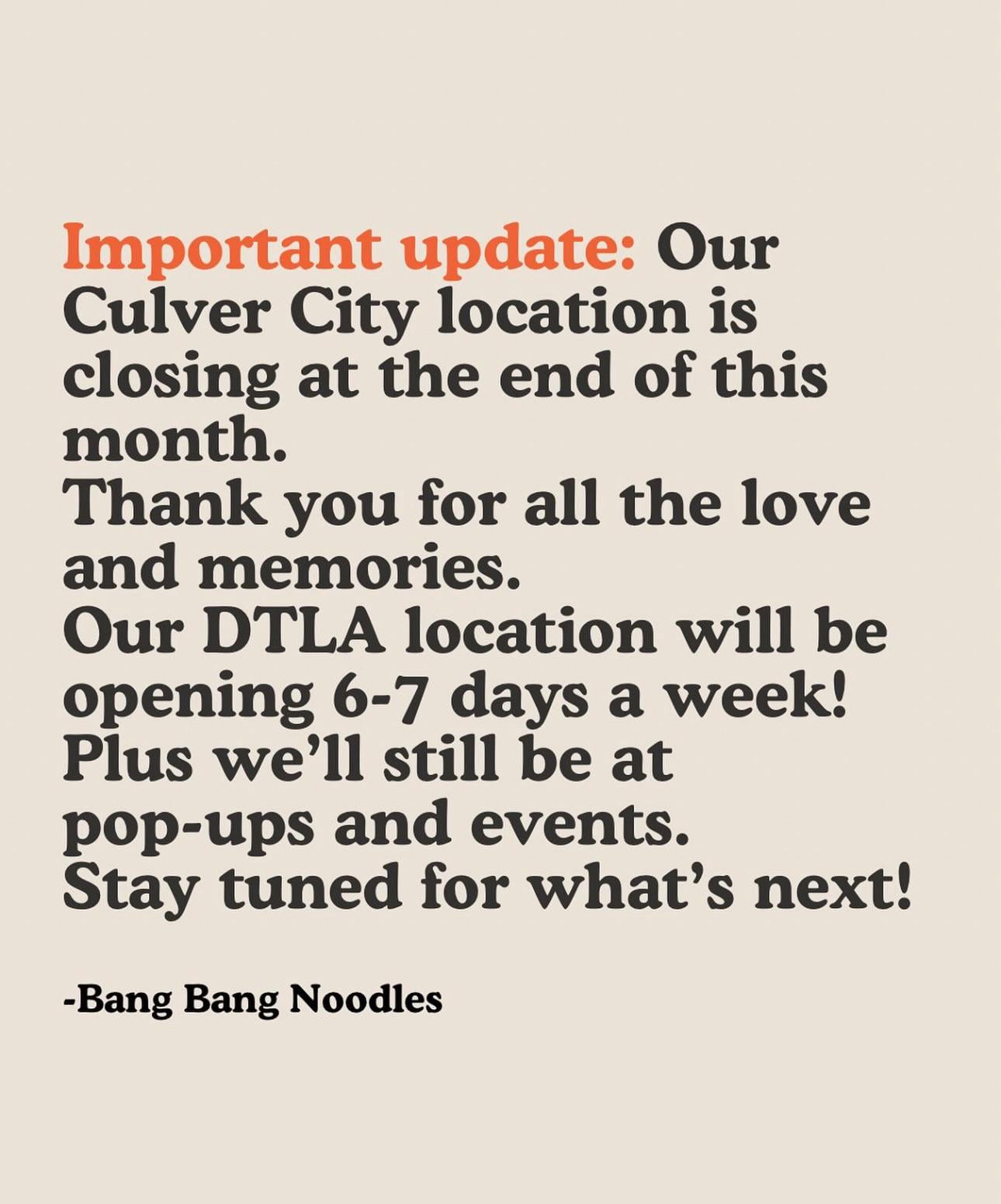 Bang Bang Noodles Culver City location to close end of June, DTLA remains open