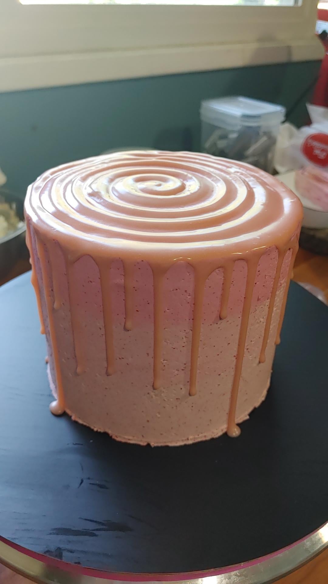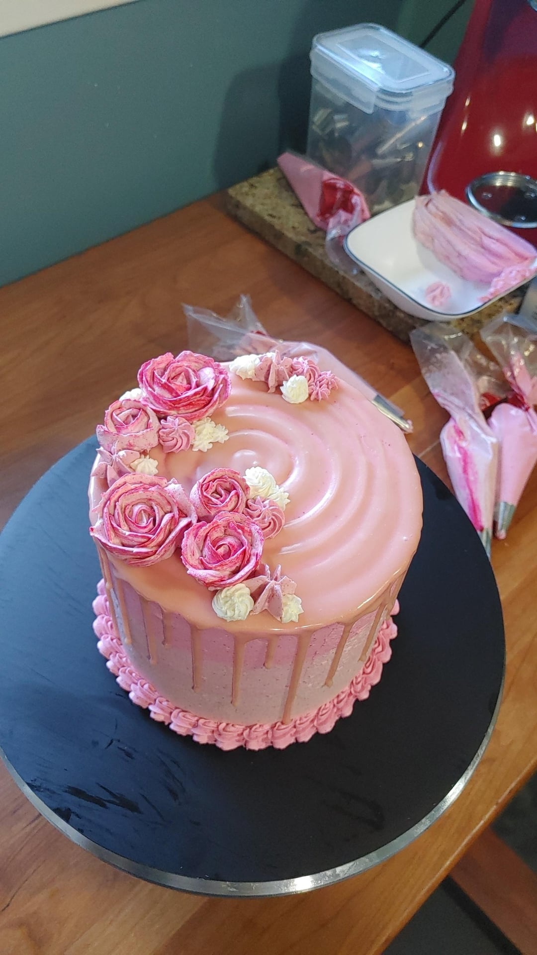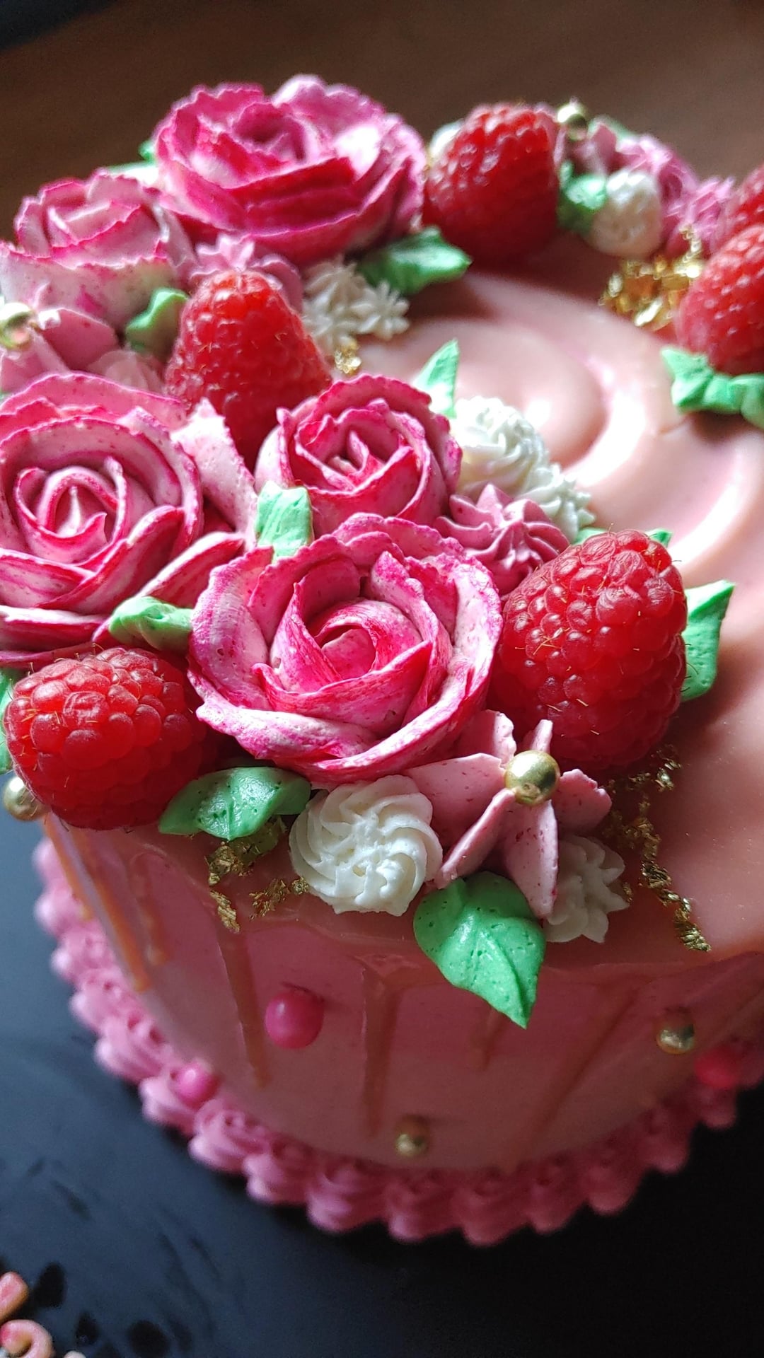 Theme requested was pink & bougie. 3 layers of 6" vanilla cake with raspberry buttercream, raspberry jam I made & fresh raspberries. Decorated with white chocolate ganache drip I added pink pearl shimmer to, raspberry buttercream roses, gold leaf flakes, gold & pink pearls.