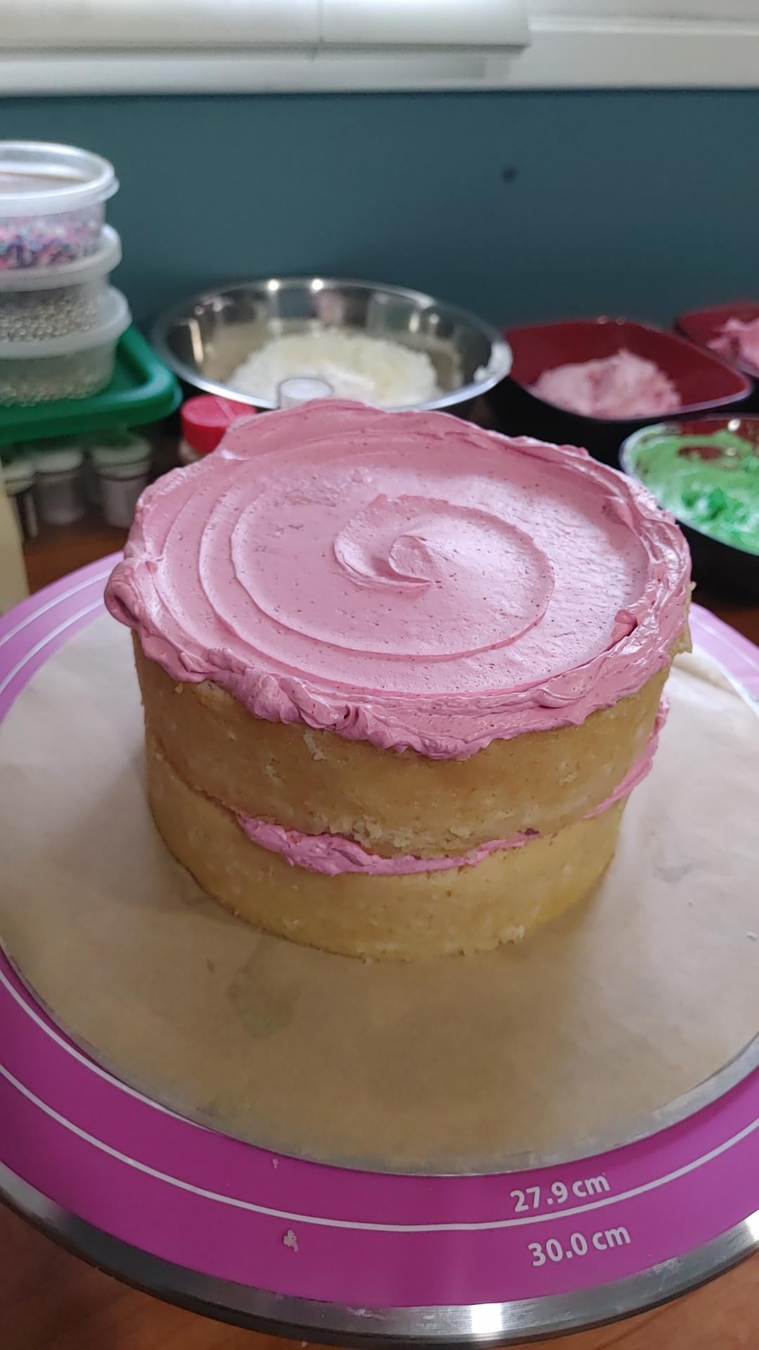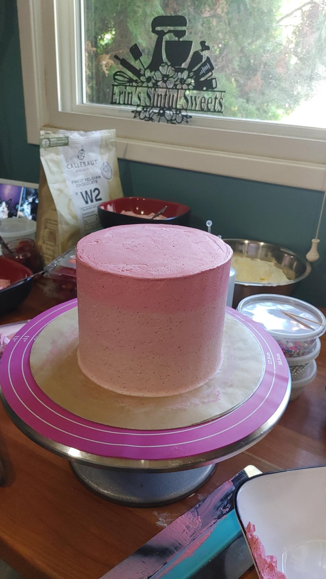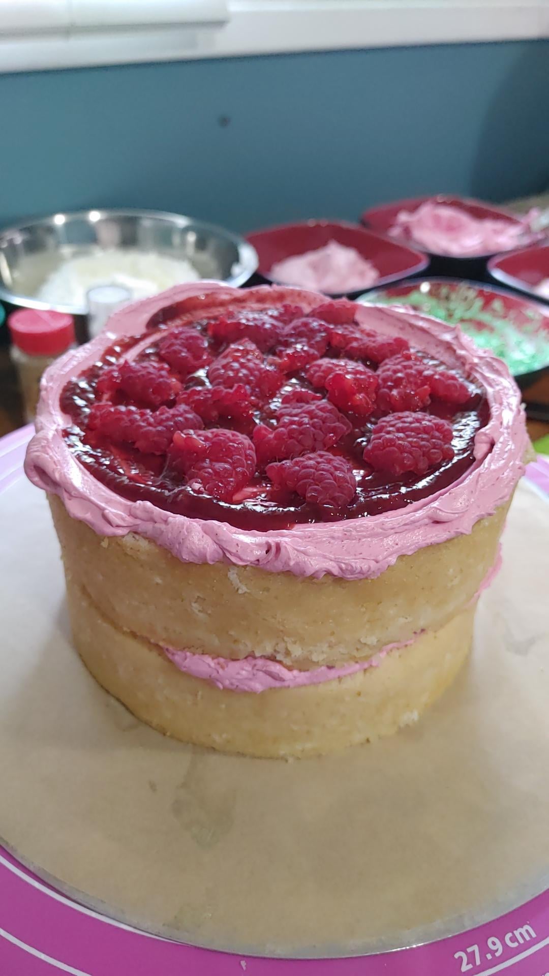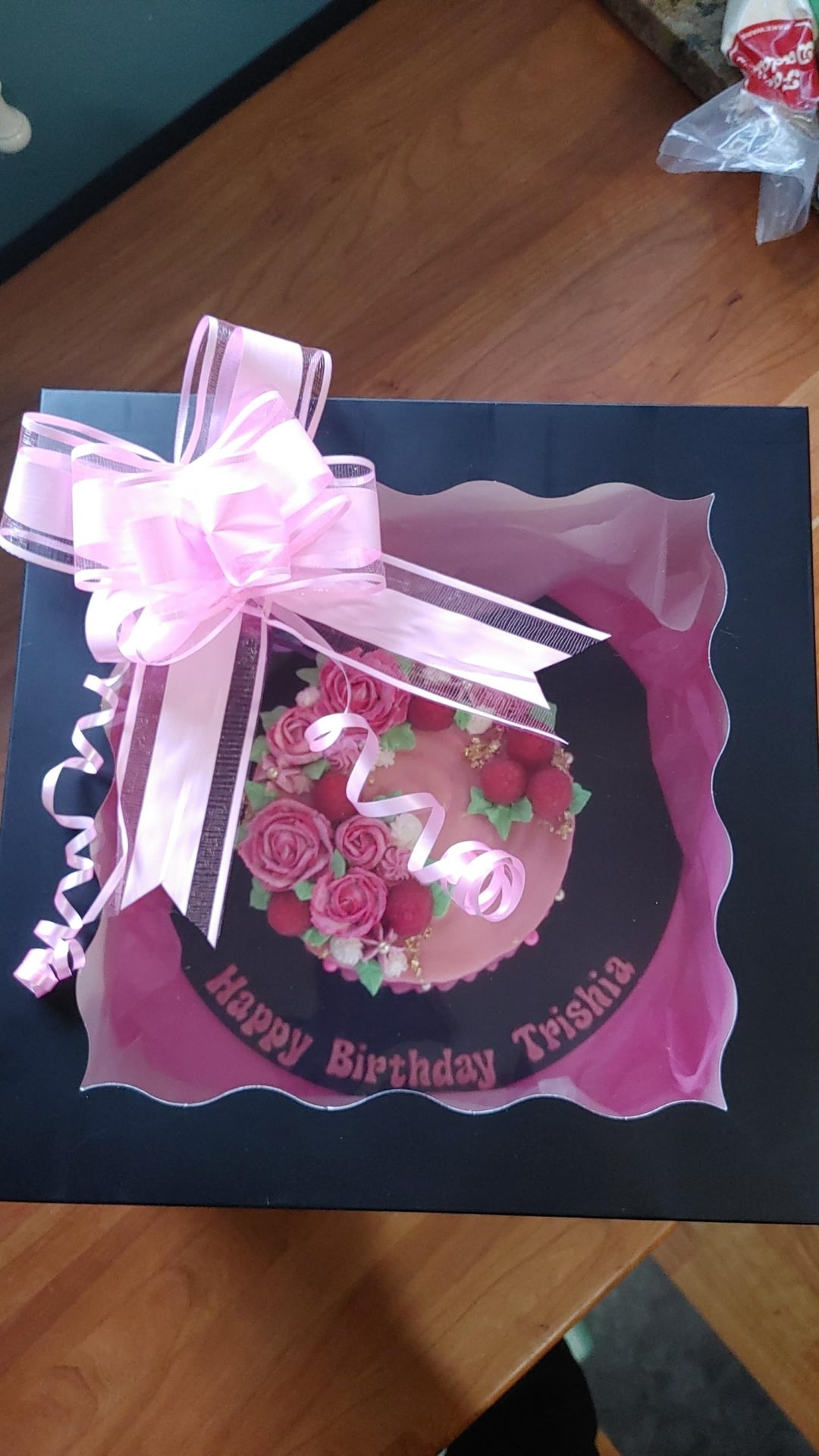 Theme requested was pink & bougie. 3 layers of 6" vanilla cake with raspberry buttercream, raspberry jam I made & fresh raspberries. Decorated with white chocolate ganache drip I added pink pearl shimmer to, raspberry buttercream roses, gold leaf flakes, gold & pink pearls.