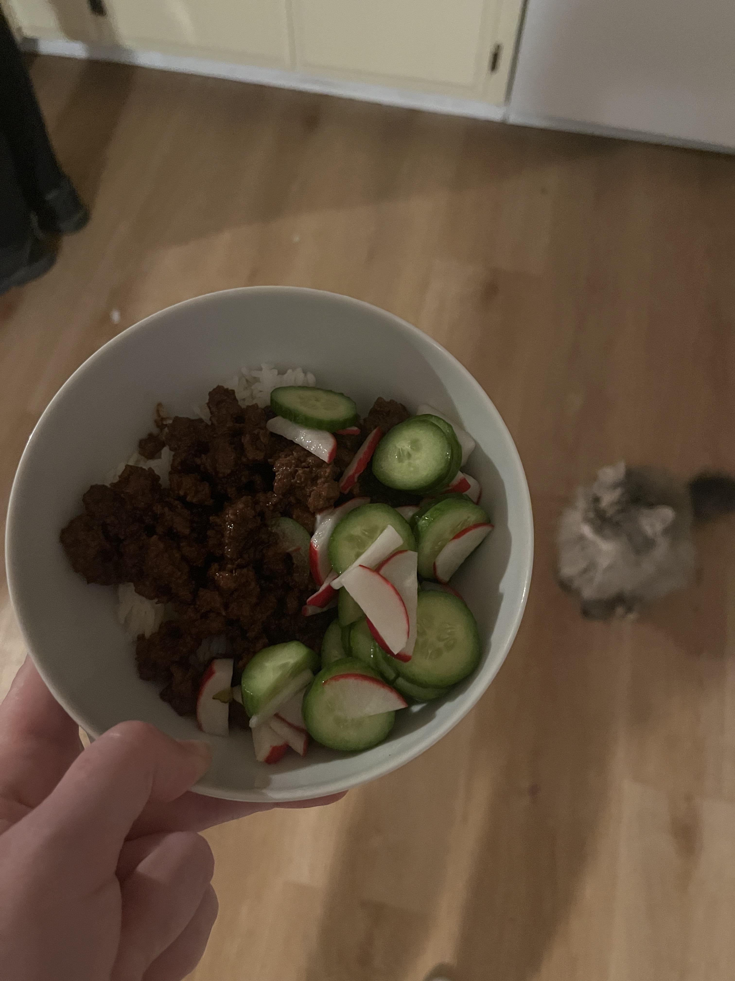 I chopped up radishes and cucumbers while that was cooking and soaked them in rice vinegar and some sugar.