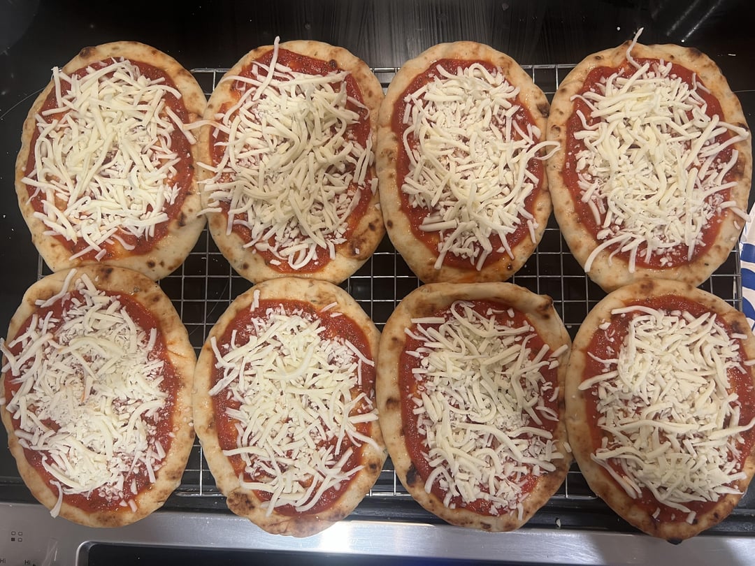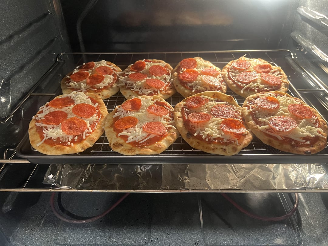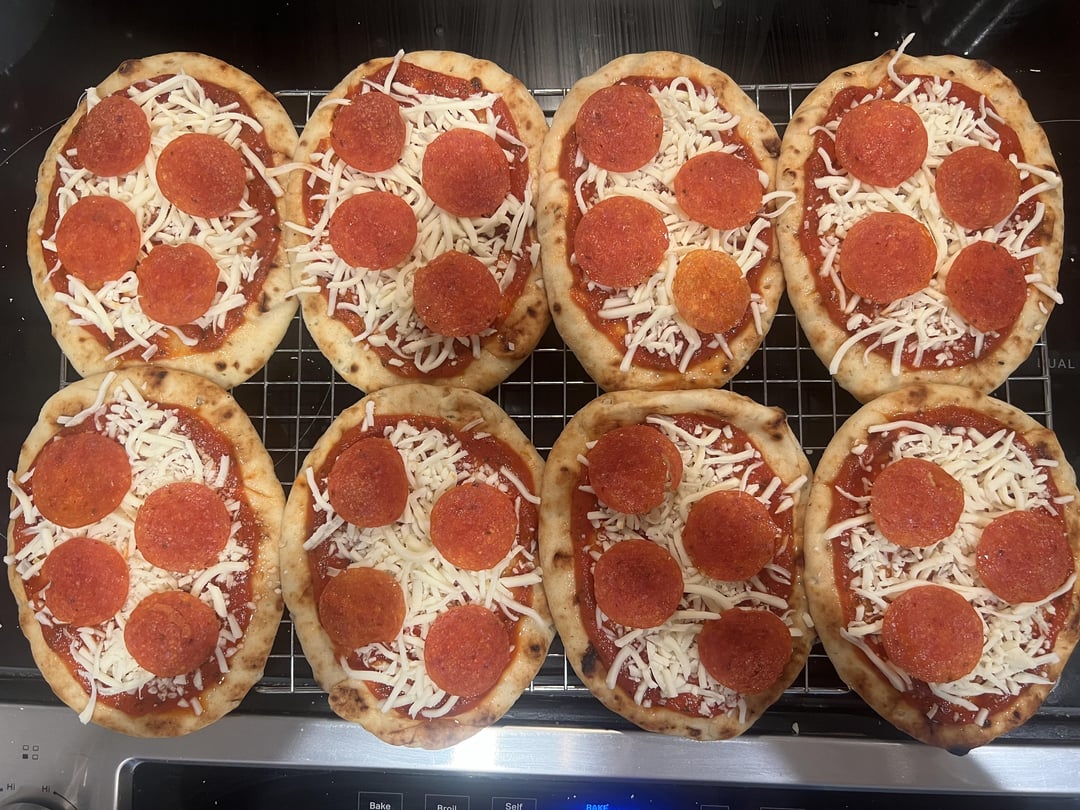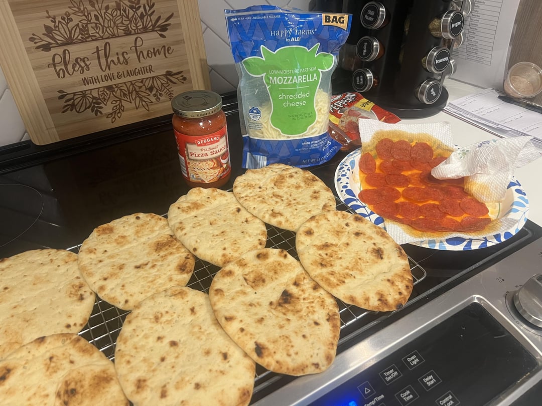If there’s any advice I can give you with pepperoni, it’s to microwave whatever you plan on using for 30-45 seconds (depends on how many) to get the majority of the grease out. It’s so nasty. I think turkey pepperoni is better with the grease but I just use the regular kind. ANYWAYS, all I did was preheat my oven to 375°f and assemble these pizzas (naan > sauce > cheese > pepperoni) and pop them in the oven for about 15 mins. Gonna freeze them on the baking sheet and then put them all in a resealable bag so we can grab some and reheat in the oven whenever we want a little pizza. Enjoy!