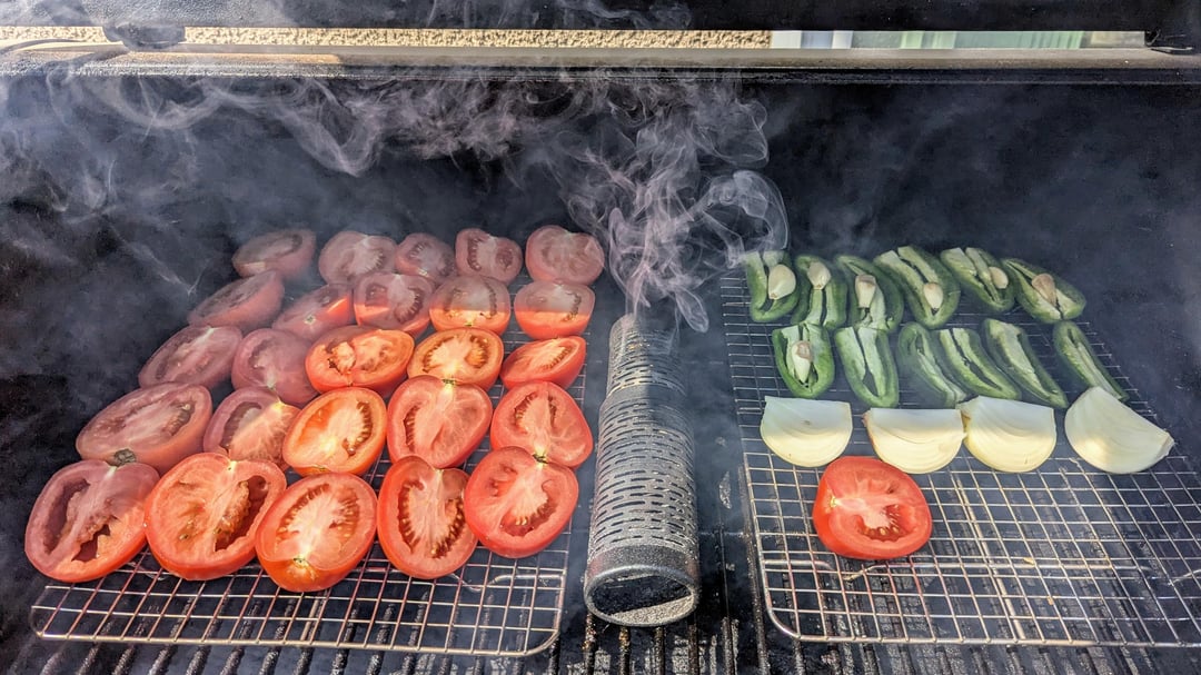 smotrs 3 months ago – 12 Roma – 6 Jalapeno, deseeded – 1 Onion – 1/2 head of garlic – salt to tasteWill add cilantro when ready to eat.Smoked 2hrs at 200⁰, then charred on the grill for about 5min. Blended using mince setting on Ninja.
