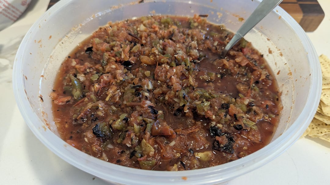 Just a small batch, nothing special, for some guests visiting.Smoked 2hrs, charred about 5min them blended when cool enough to touch.by smotrs 2 Comments smotrs 3 months ago – 12 Roma – 6 Jalapeno, deseeded – 1 Onion – 1/2 head of garlic – salt to tasteWill add cilantro when ready to eat.Smoked 2hrs at 200⁰, then charred on the grill for about 5min. Blended using mince setting on Ninja. Desperate_Hat_4544 3 months ago So chunky!!! 😍