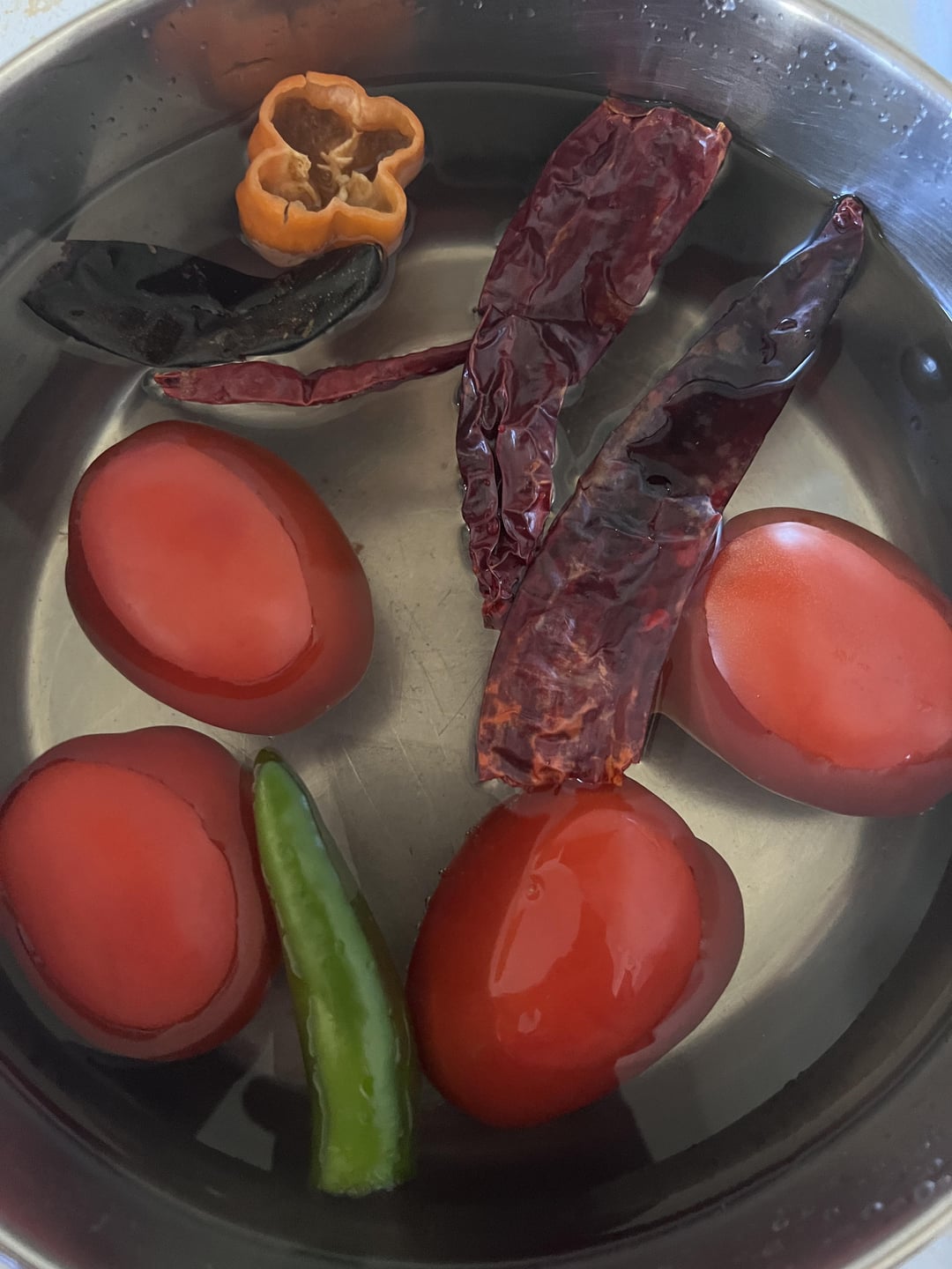 4 Roma 1 Serrano 2 California chiles 1 guajillo chile 1 chile de arbol 1 habanero 1 quarter onion 3 roasted garlic cloves 2 tablespoons chicken bouillon 1 fried corn tortilla Quarter cup waterBoiled then blended by ravenstar333 Dining and Cooking