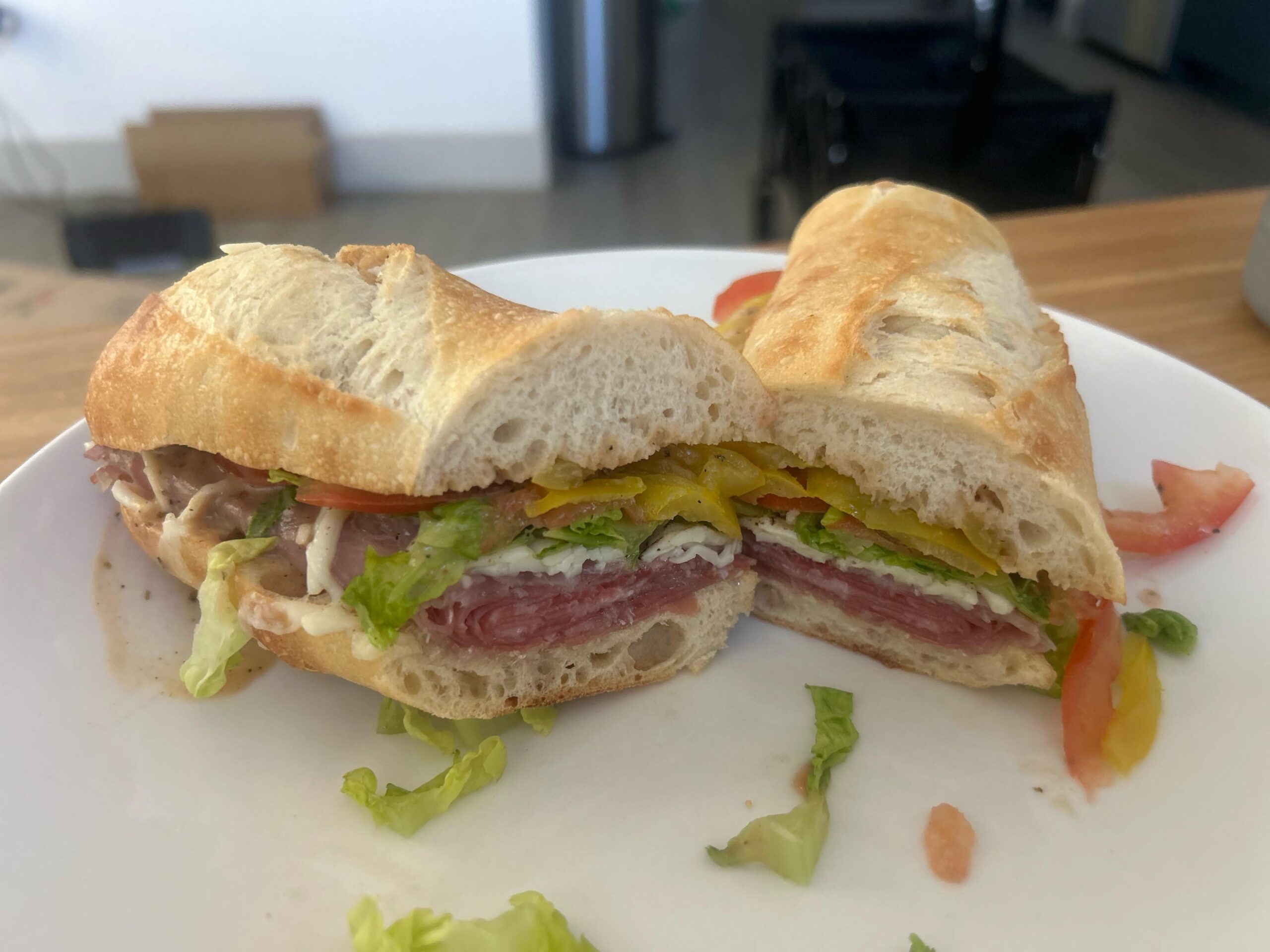 Semi-classic Italian with lettuce tomato and sub dressing. It’s actually totally solid but there’s something about eating a bought sandwich that makes it so much better. I think the process of making it ruins some of the anticipation. Anyway, I can rarely buy a $15 sandwich so I’m my own sandwich artist.