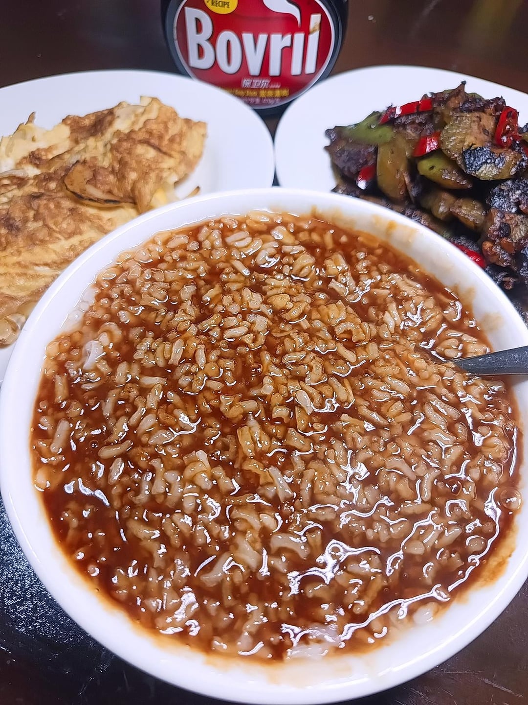 Rice porridge with Bovril, onion omelette, Fried Dace with Bittergourd in Fermented Black Beans 💗🤤 by Big_Biscotti6281 Dining and Cooking