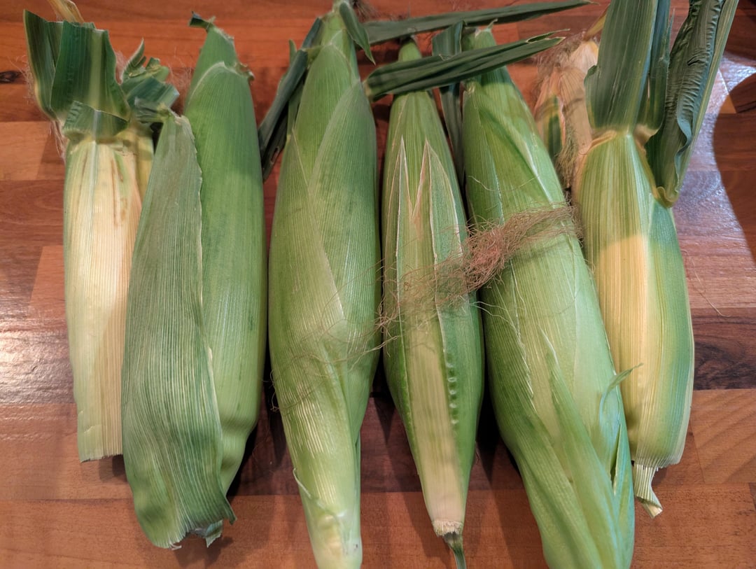 We picked a few ears last week. Sadly one was already too far gone, and the kernels were dry and shriveled. So this week we went out again and found 6 that look perfect. We'll be eating corn every night for the next 3-4 nights!