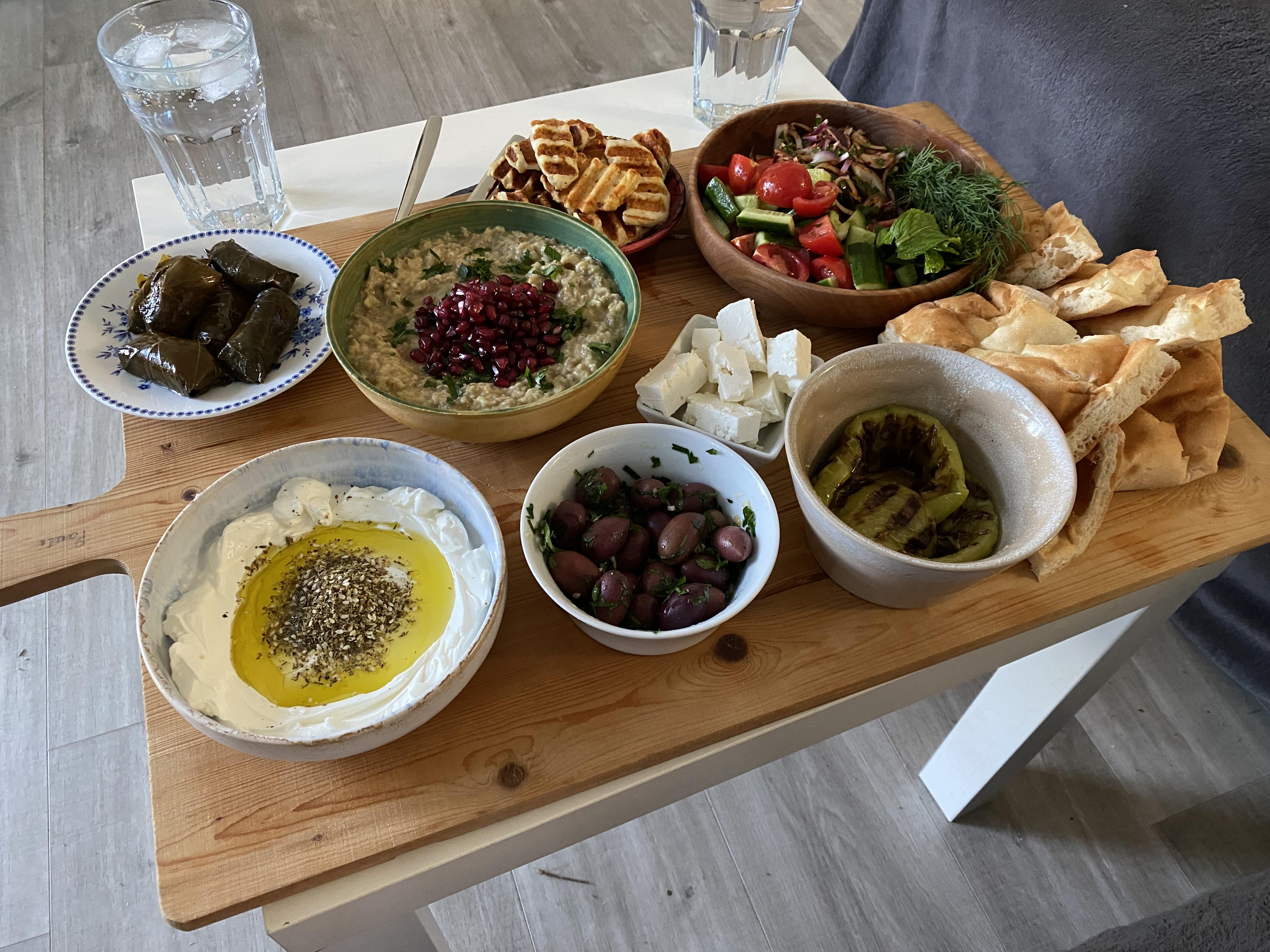 From left to right: Stuffed grape leaves, labneh with zaatar and olive oil, baba ghanoush, fried halloumi, Kalamata olives, sheep milk feta, salad and herbs, grilled pepperoni and bread. All homemade except for the grape leaves.