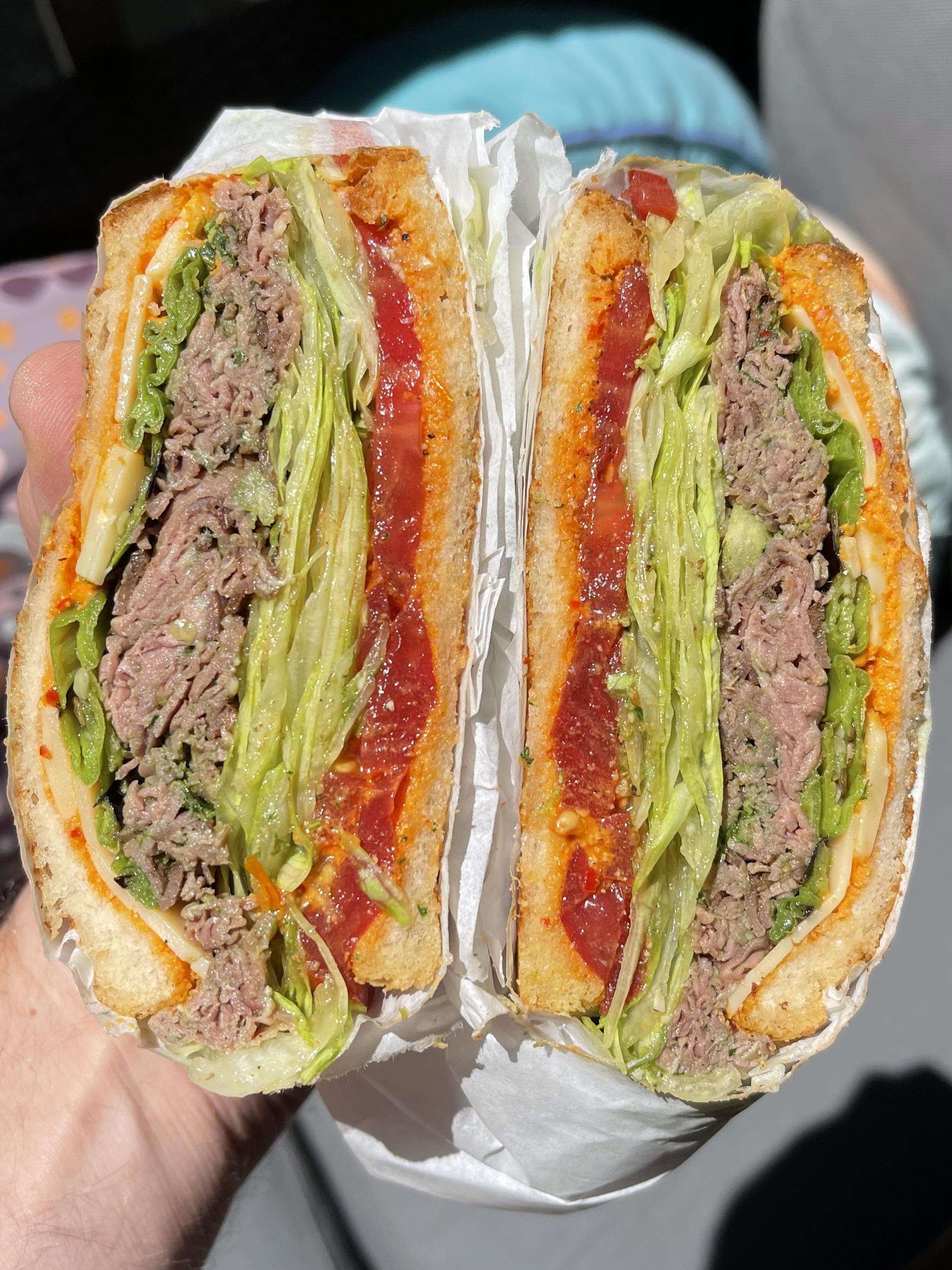 [homemade] Chimichurri’d roast beef, seasoned heirloom tomato, shredded dressed iceberg, blistered shishitos, Jimmy Nardello and early girl hazelnut romesco, vintage white cheddar.