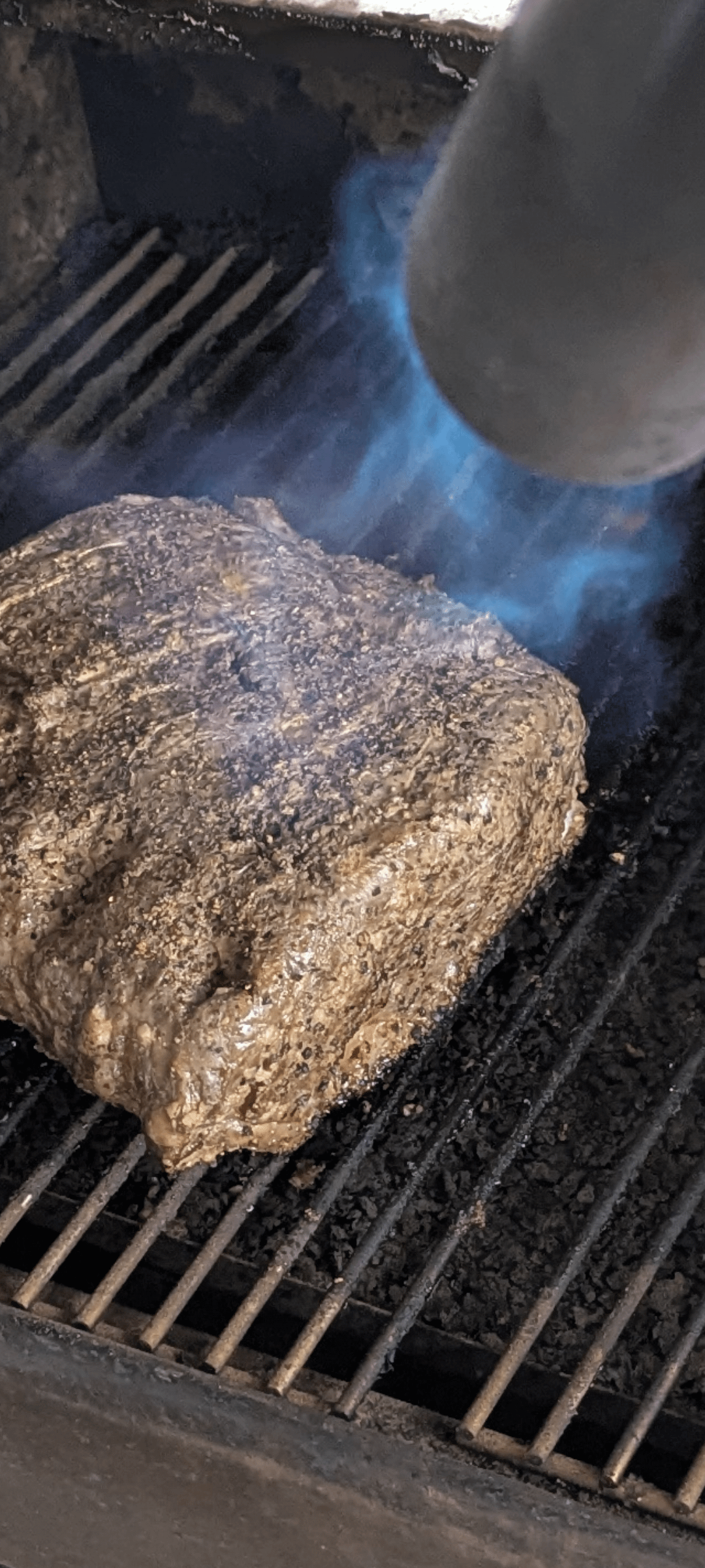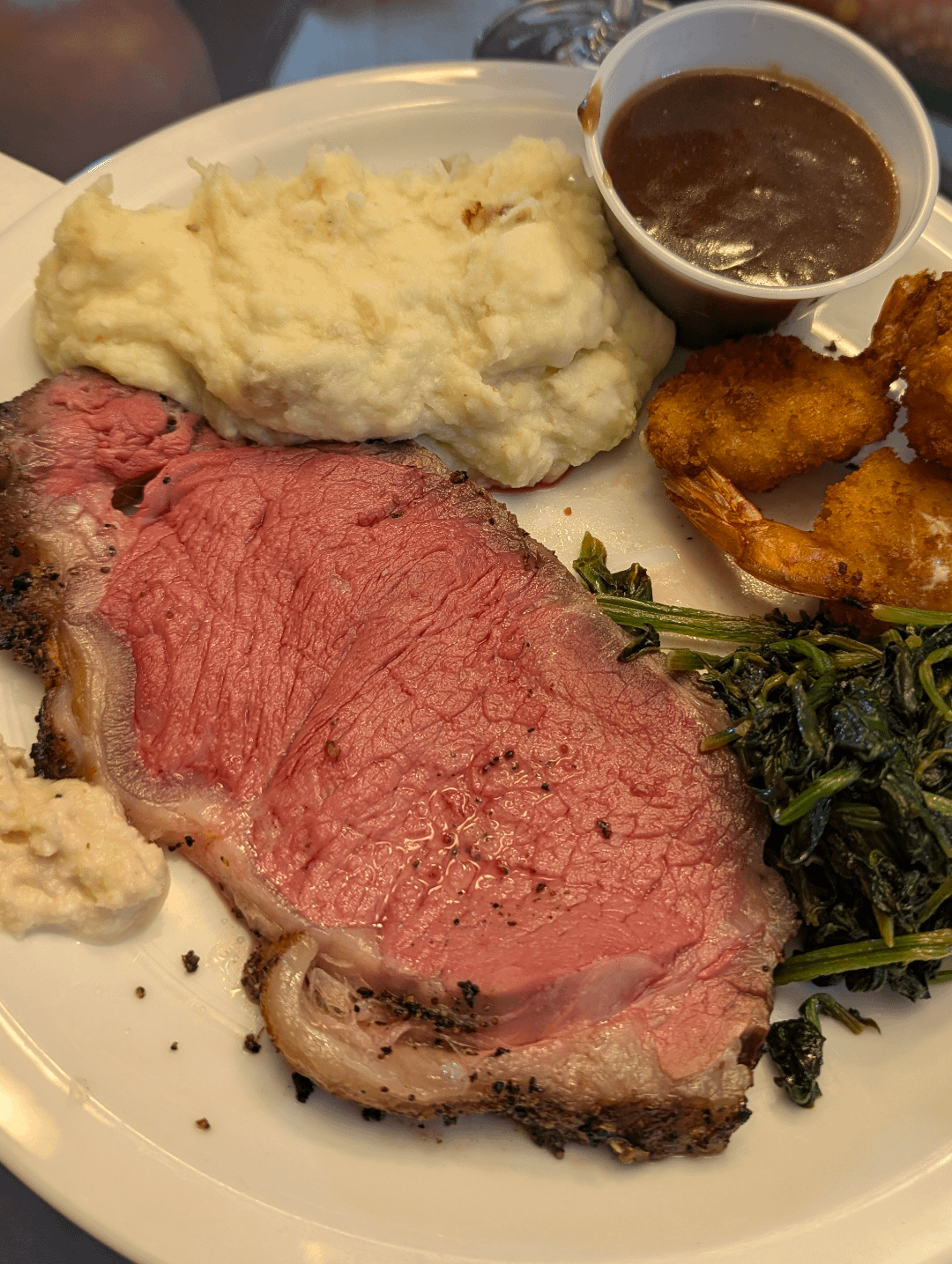 24 dry rub, 8 hr souse vide @135°, 10 min ice bath, and 10 minutes under the blazing blue flame if the torch. Served with roasted garlic mashed potatoes, breaded shrimp, sauteed spinach, and an unbelievable au jus from the bg drippings.