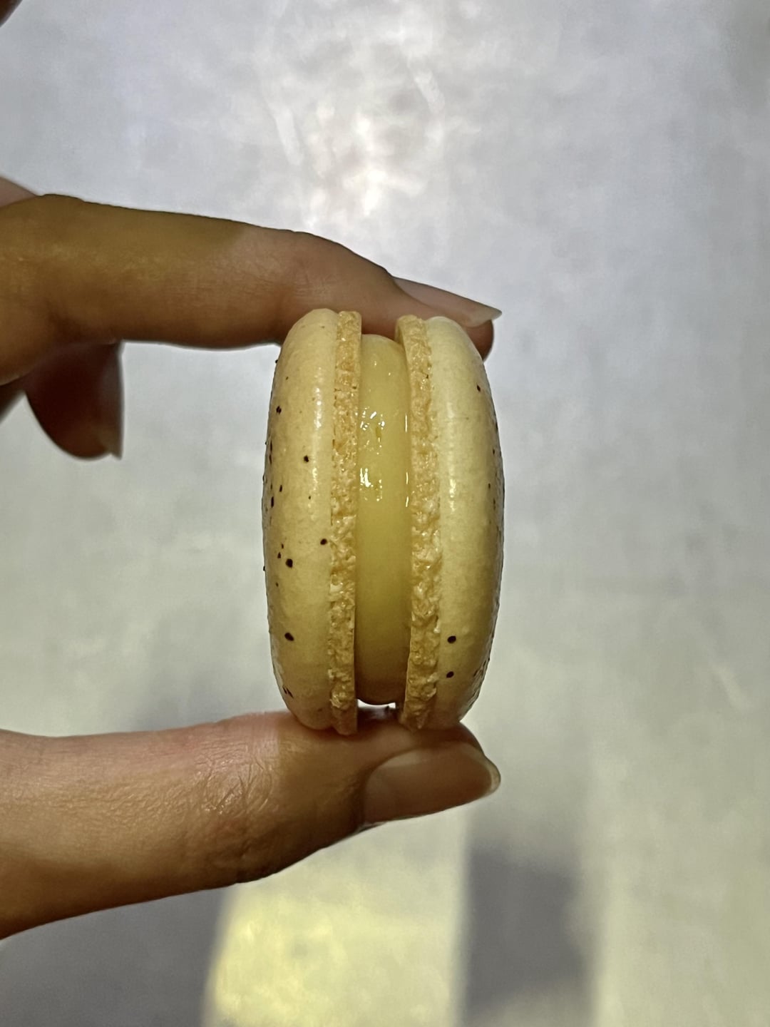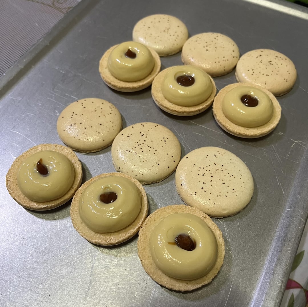 started practicing making macs early this year and had some progress for a while. still experimenting with different mats and temperature. also been exploring different flavor combinations. this right here is a coffee ganache (pastry cream based) with caramel center 😊😊😊