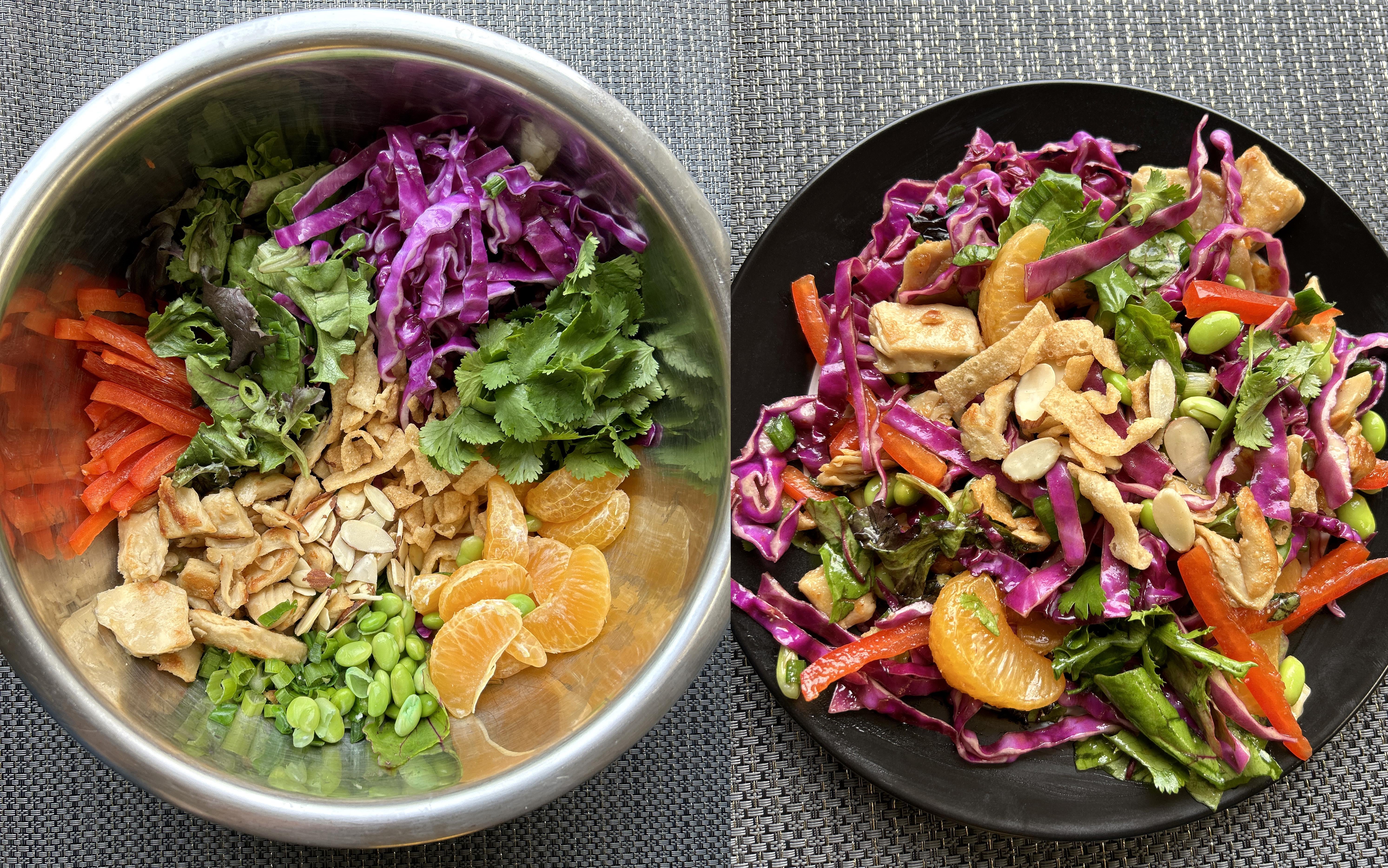 Right side is one serving. Left side of pic: 2 servings total, 65 g red bell pepper, 125 g cabbage, 93 g mandarin orange, 37 g edamame, 1/2 bag Beyond Chicken pieces, cilantro, green onion, 7 g sliced almonds, 12 g wonton strips. Dressing added after mixing – see comments.