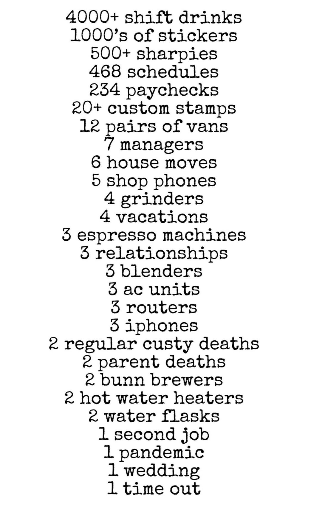 I’m so utterly grateful for my quirky lil shop where we can dress as we please and listen to whatever we want. I’m thankful for my (owner/operator) boss that actually cares and listens, all of the amazing regular customers and all the new ones that will become regulars. The coworkers I’ve worked with along the way are truly an amazing group of people….even the ones that wouldn’t necessarily be coworker first round draft picks.
