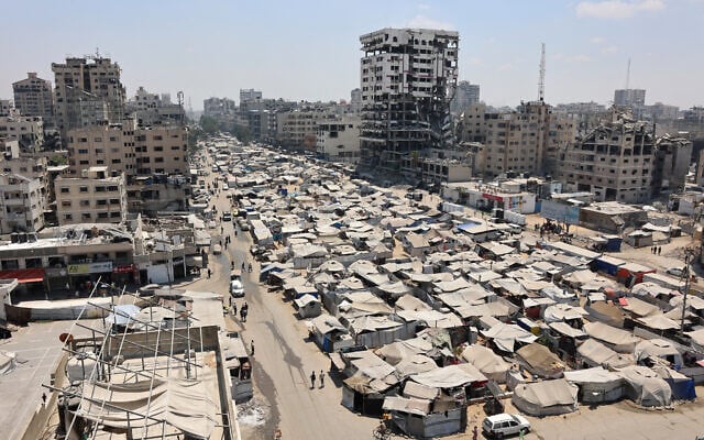 A picture taken on August 18, 2025, shows tents housing displaced Palestinians in Gaza City. (Omar AL-QATTAA / AFP)
