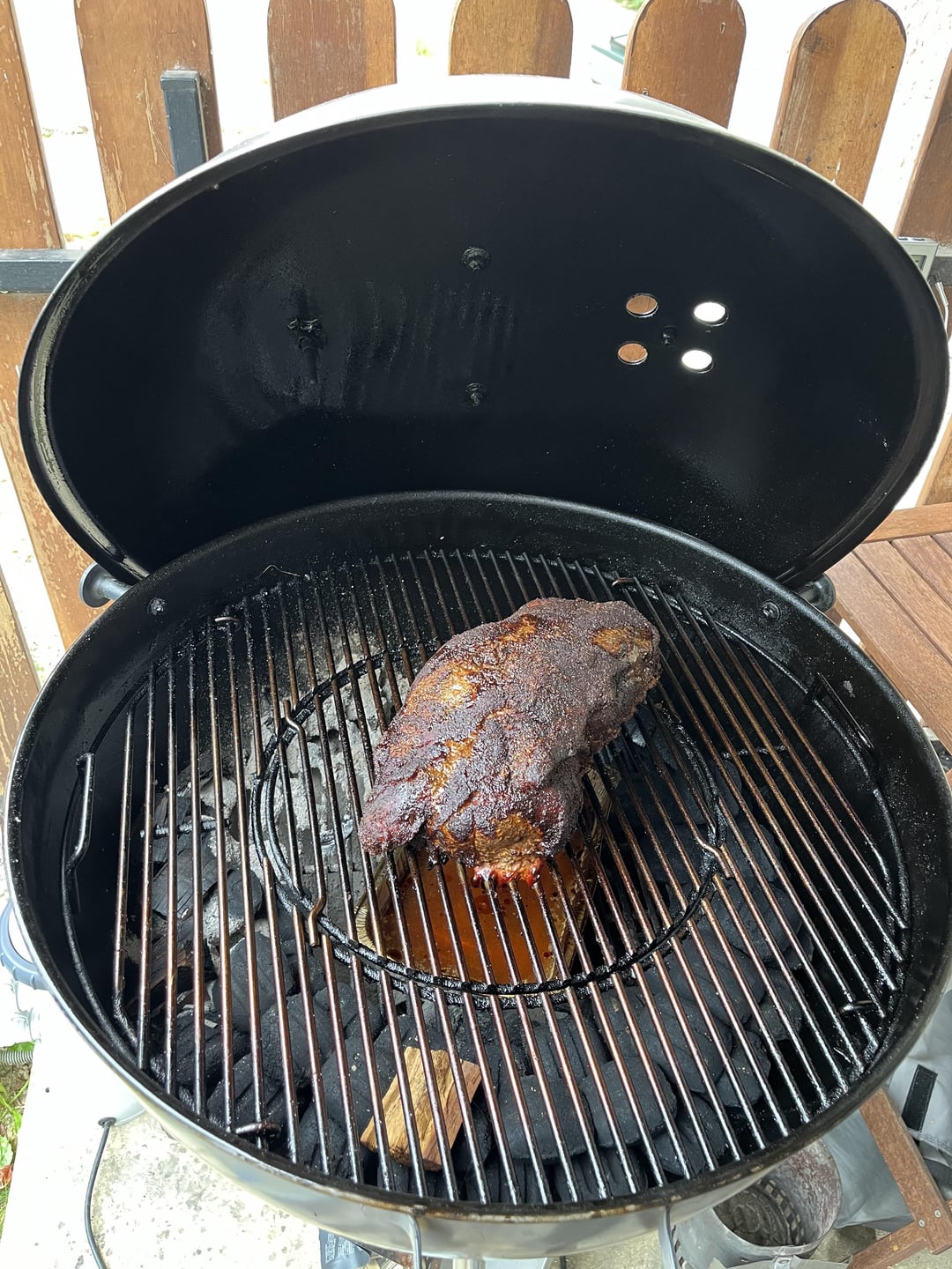 Low and slow with a snake chain, around 4 hours of smoking with apple chunks at 130C (270F) then foiled and around 3 more hours (up to 95C-200F intern temp). Let it rest 1 hour and done.