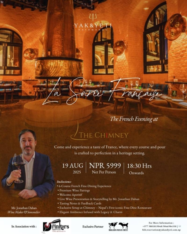 “We are delighted to offer our guests this unique gastronomic journey. La Soirée Française at The Chimney is a perfect opportunity to explore fine wines and savor French culinary excellence in an elegant and heritage-rich setting,” said Pallavi Mishra, Director of Food and Beverage, Hotel Yak & Yeti.
