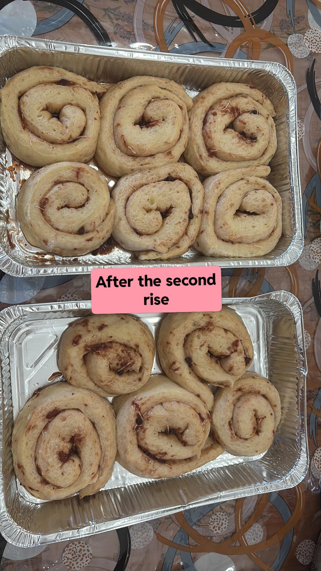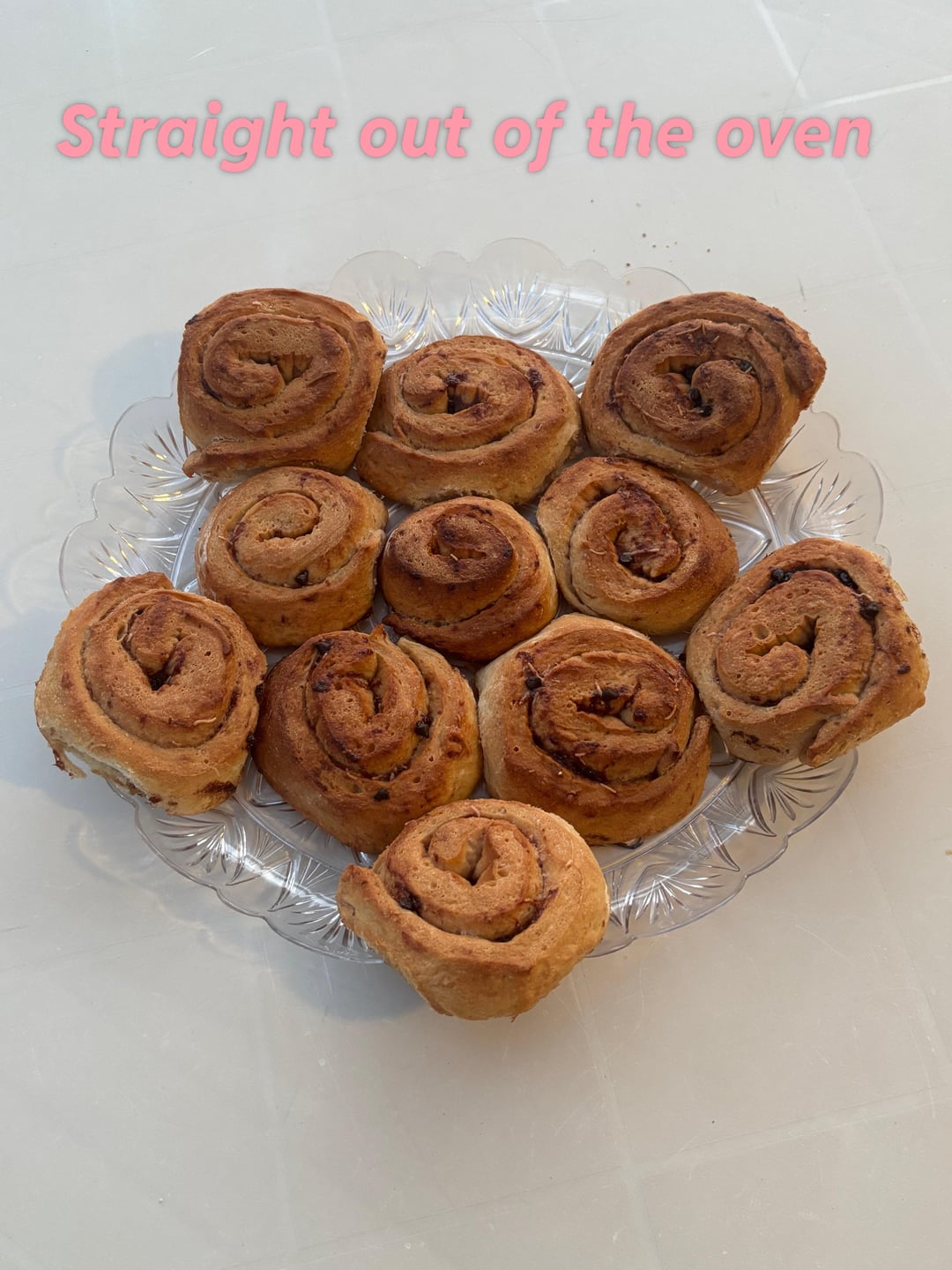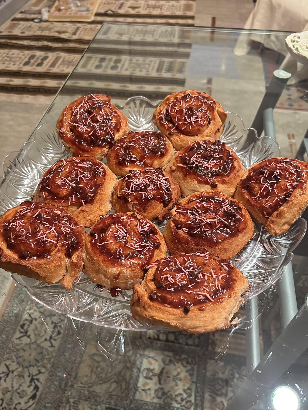 After it has approximately doubled the size roll out the dough with a rolling pin, spread the strawberry jam, dash cinnamon and add chocolate chips on top of it (don’t make the same mistake I did and use a thin layer of jam otherwise it will spill when you roll it up) roll it up, and cut it into rolls. Place them in a baking tray (oil the base of the tray otherwise they’ll stick), cover them with a cloth and let them rise for another couple of hours.