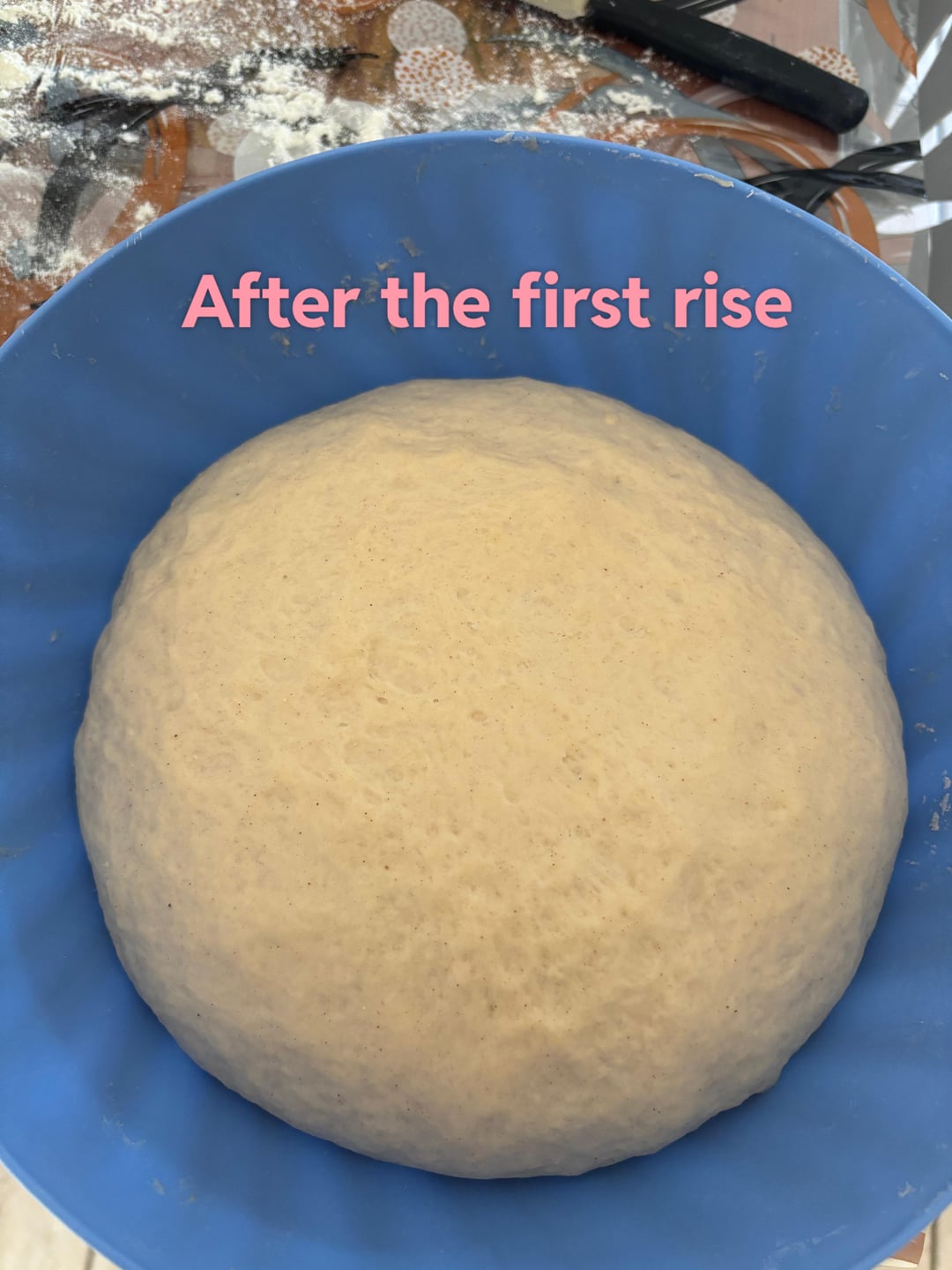 In another bowl mix flour, sugar, and salt then add the milk with yeast we set aside previously, add seed oil too (I mixed first with a spoon, then kneaded by hand). Cover the dough and let it rise for one hour/ one hour and a half in a warm place.