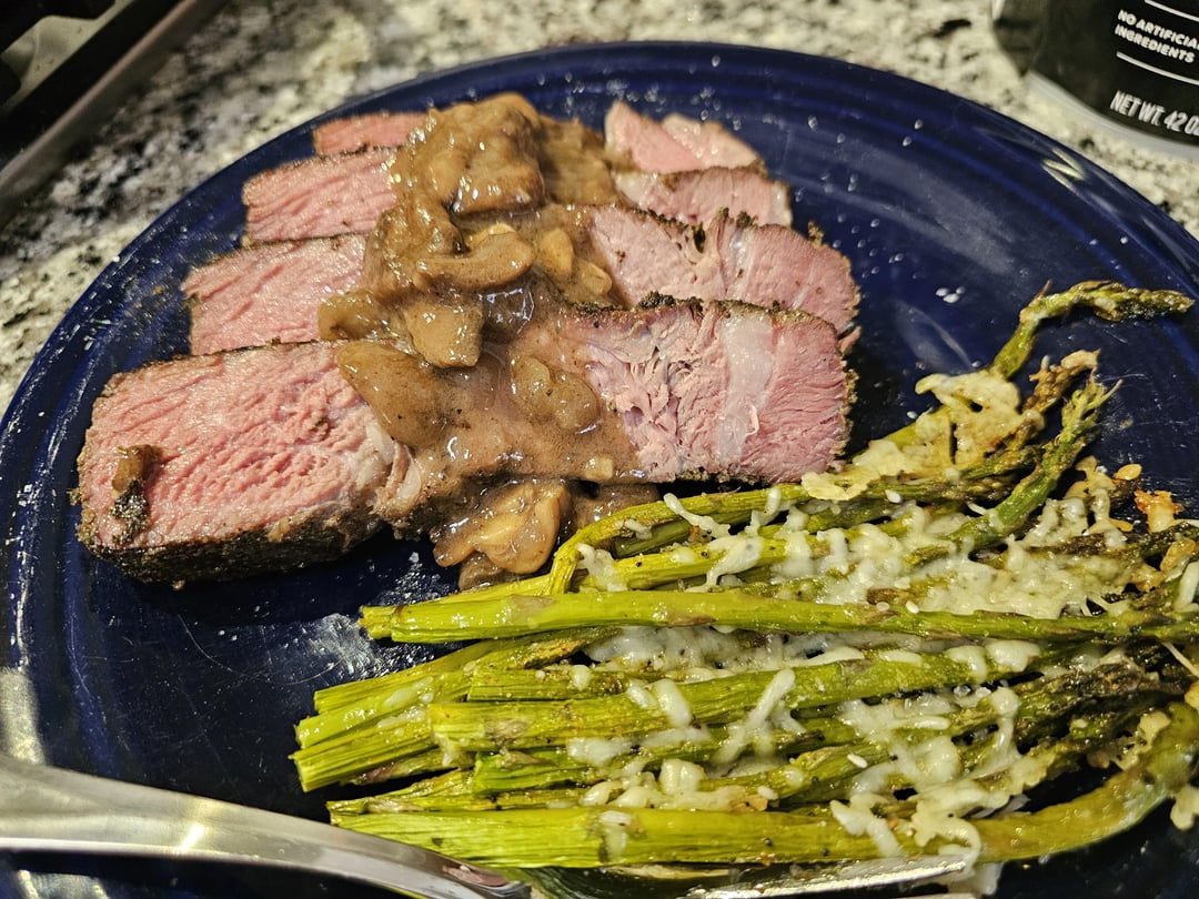 Cooked at 137 for 32 hours. Seared in wagyu tallow. Made a sauce with mushrooms, garlic, butter, and bag juice.