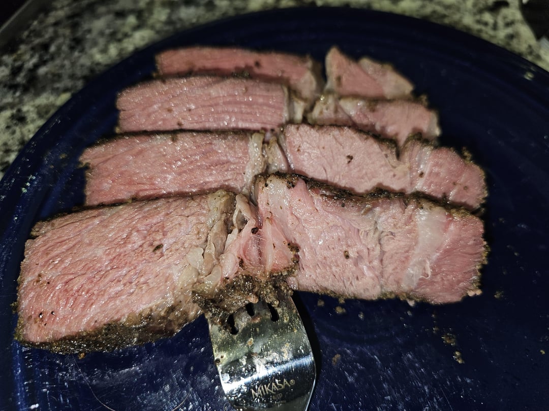 Why is the second picture so pink but plated is medium? Flash seared? Hot tallow?