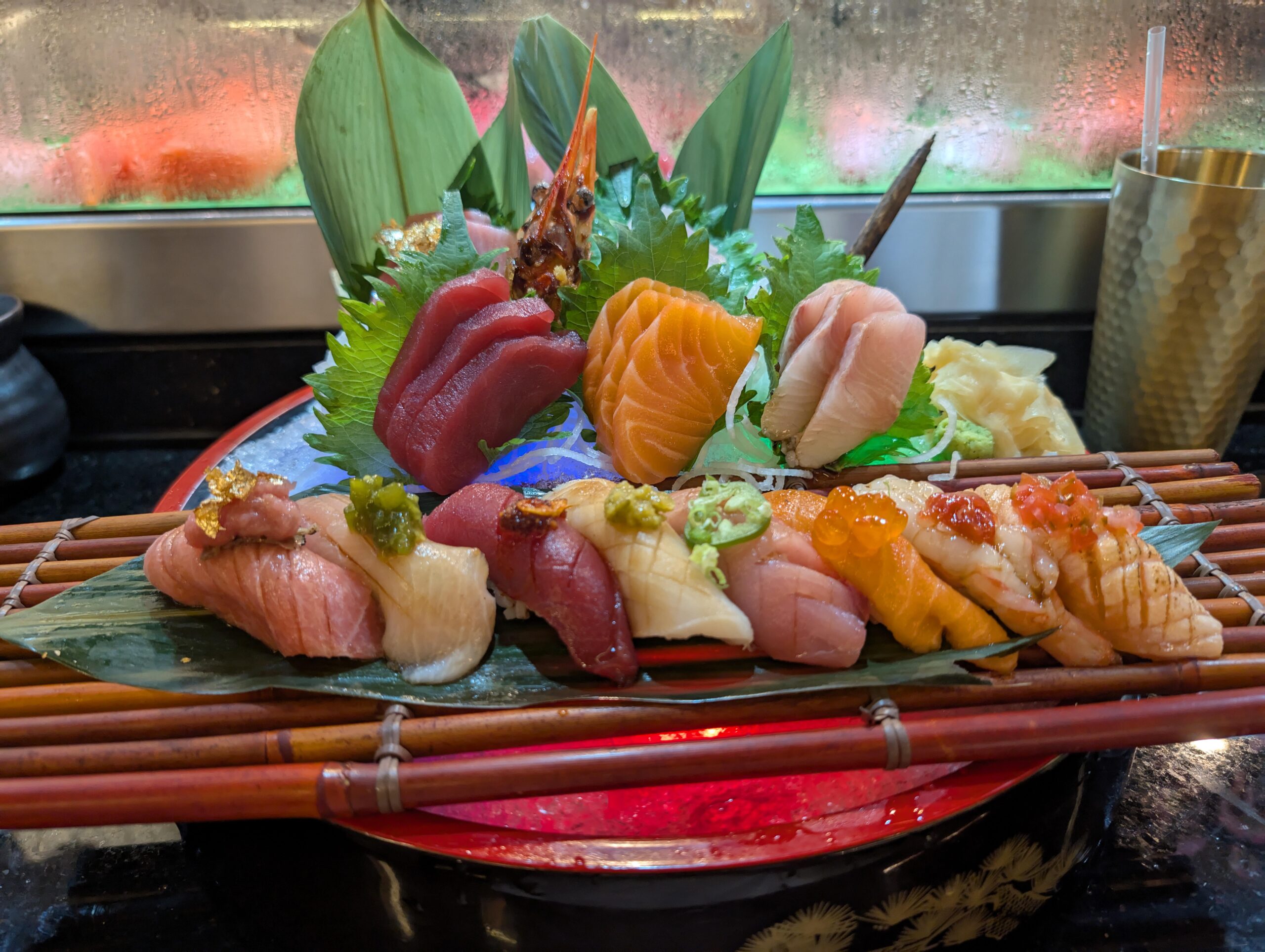 13. I don’t know if it’s me but it looks like there’s a 3rd row with 2 types of fish and the one on the left has gold leaf. If so, you are. Most of the price of sushi is paying for the cut/type of fish and the quality.