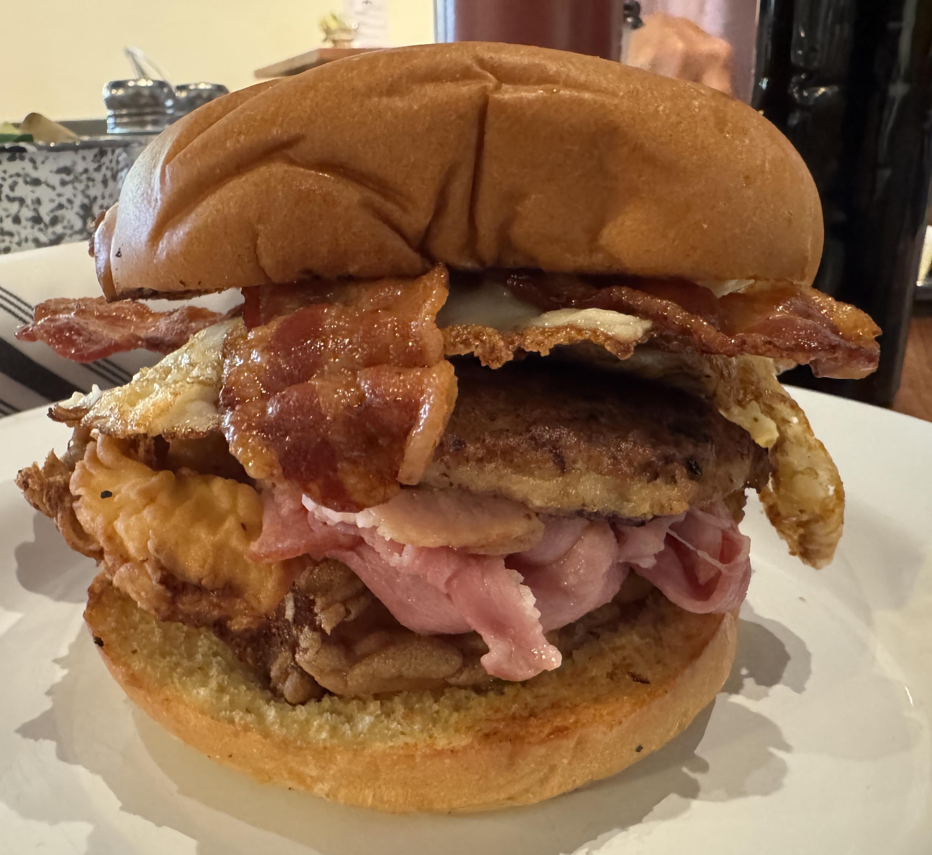 It’s the WEC—BEC from a local eatery, a Bacon, Egg, and Cheese. However, I call it the WEC-SHBECC. I have them add sausage, ham, and recently started having them add the breaded chicken patty they use for some of their sandwiches. Not pictured, but I always top with hot sauce and ketchup. Bring on the critiques and hate!