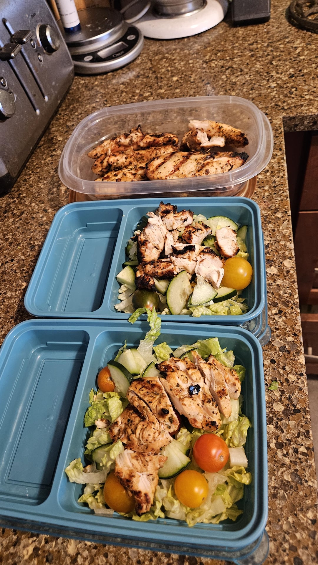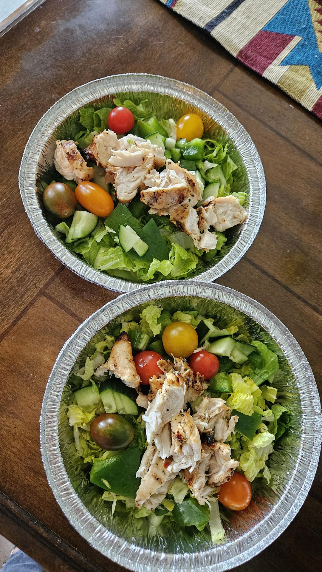Chopped grilled chicken salad w cherry tomatoes, cucumber and green bell peppers
