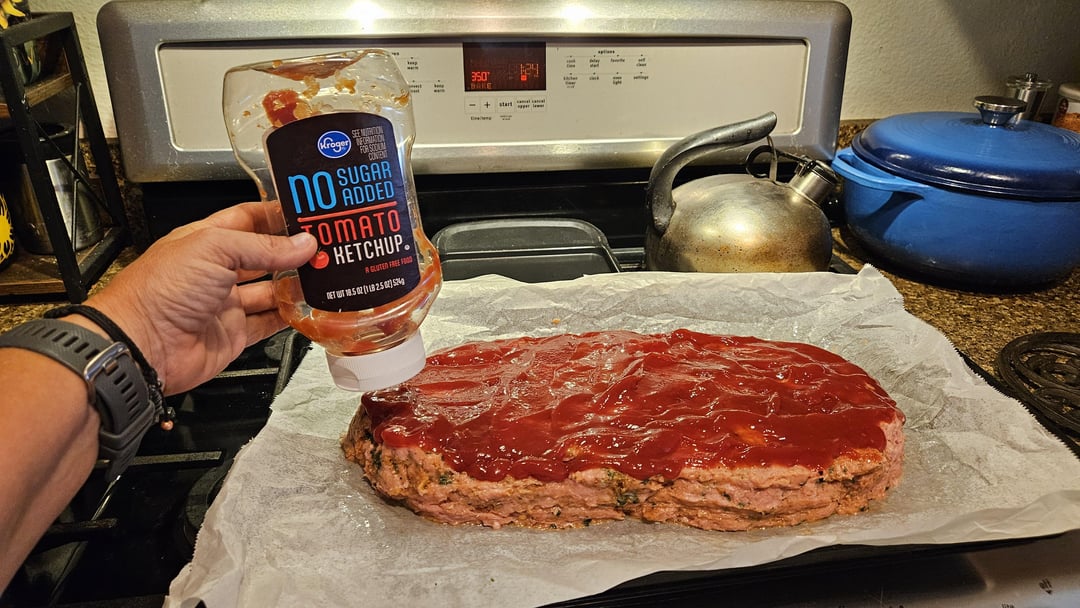 Dump the turkey mixture in the sheet pan and form into a loaf. Spread the ketchup on top.