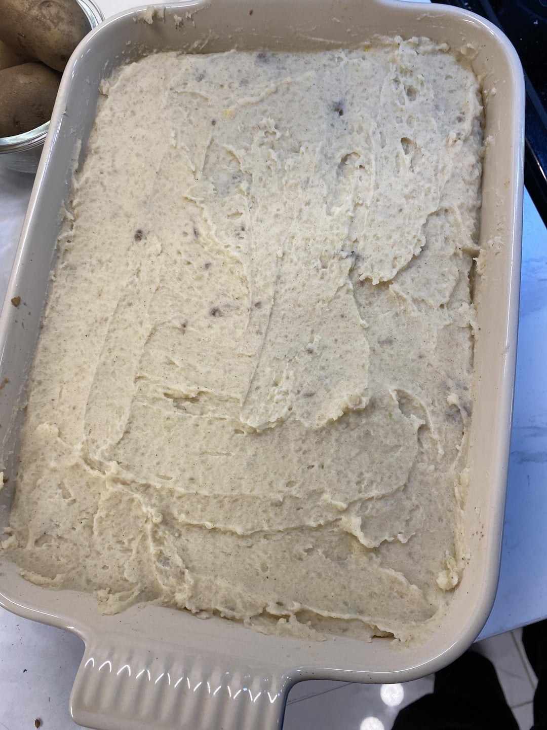 3. Layer beef mix into a casserole dish, top with potatoes (rake with fork for texture).