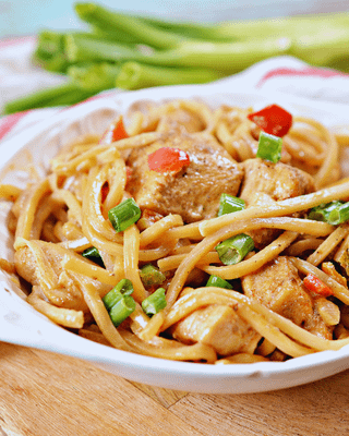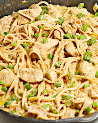* 1 lb of boneless skinless chicken breast cut into bite-sized pieces * ¼ cup onion chopped * ¼ cup bell peppers chopped * 2 tbsp olive oil divided * ½ tsp chili powder * ½ tsp cumin * ¼ tsp paprika * ¼ tsp garlic powder * ¼ tsp onion powder * 1 can of Palmini linguine noodles (rinsed well and drained) * 1 cup heavy whipping cream * ½ cup of chicken broth * Salt and pepper to taste
