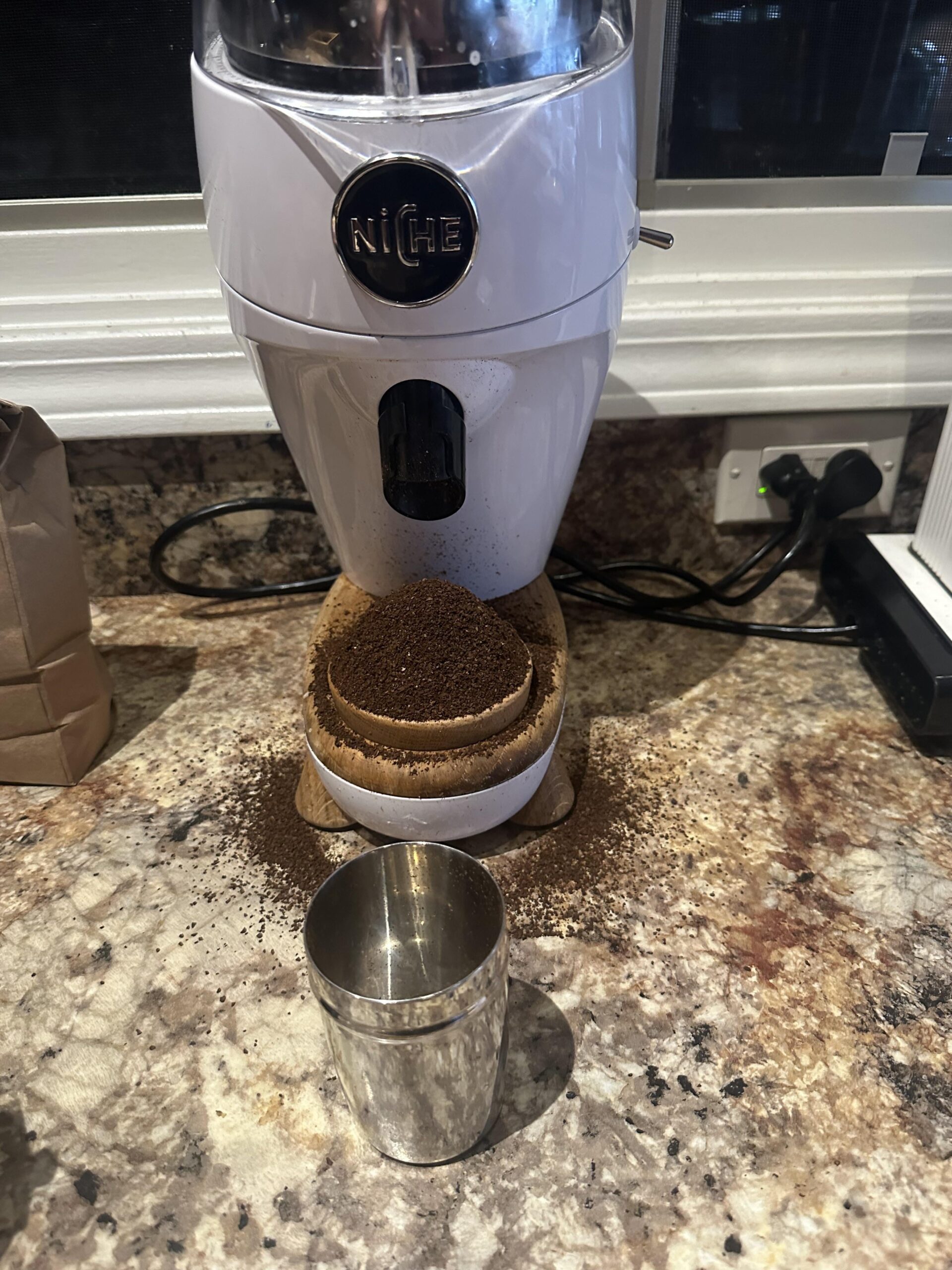 I forgot to attach the magnetic catch cup to my hand grinder and walked all around the kitchen while grinding. 19 grams, and a whole “lap” around the kitchen island later, I stepped on slippery powder and realized what had been going on for 80 turns of that handle.