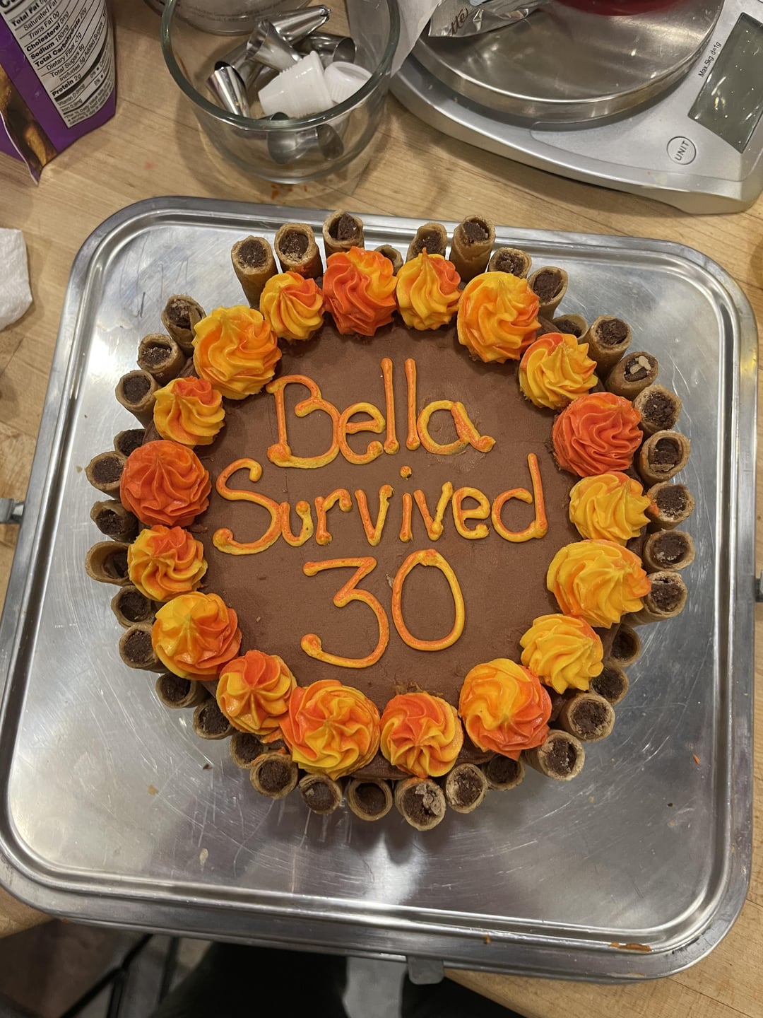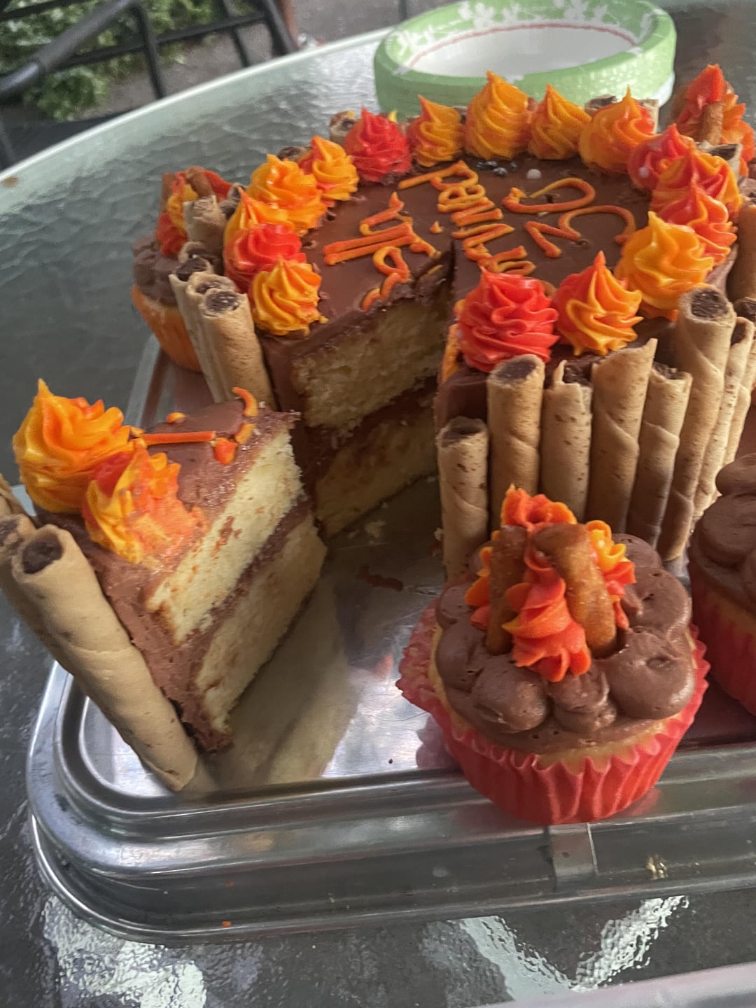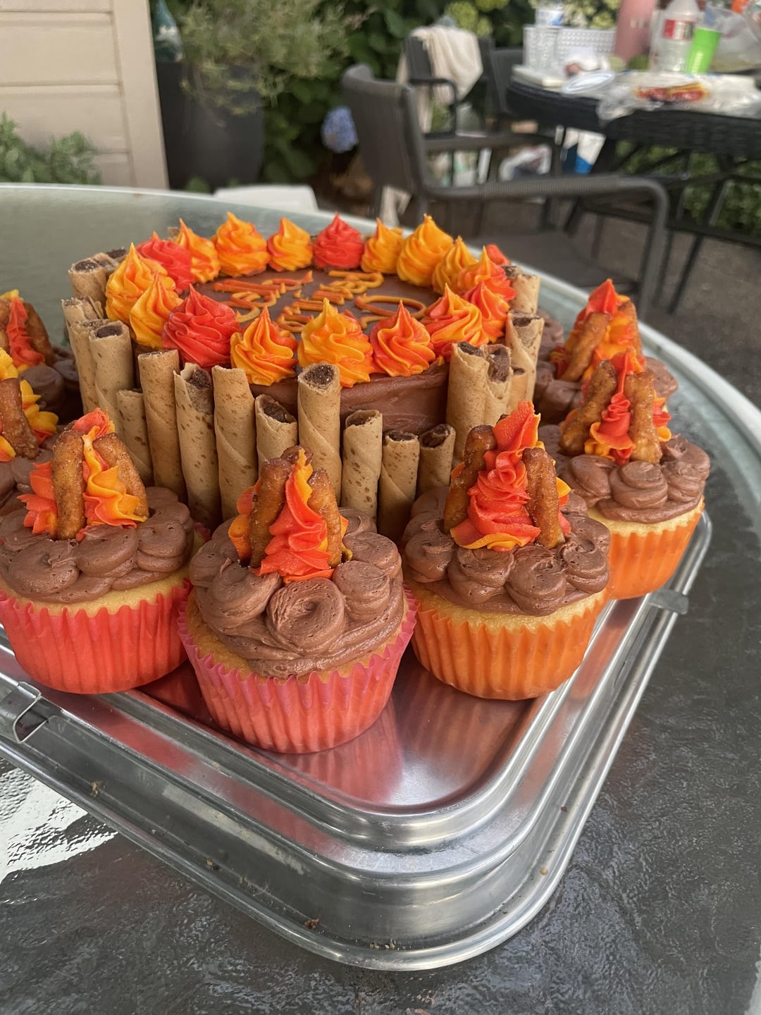 Survived themed cake, fire represents your life here on the island! Yellow cake, chocolate ganache frosting, and American buttercream frosting!! Oh and cinnamon sugar twist pretzels!! They were sooo good!