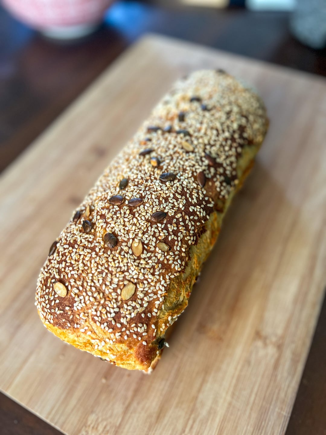 Mix all the ingredients in a stand mixer. Form a tight ball. Make it rise for 2 hours. De gas the dough, then shape it into a rectangle and roll it onto itself to shape it into a tube. Put the dough in a greased loaf pan and make it rise again for roughly 30/40 mins. Top it with seeds (if you want) and spray a generous amount of water over the top of the dough. Bake at 200 degrees Celsius (or roughly 400 Fahrenheit) for 35/40 min.