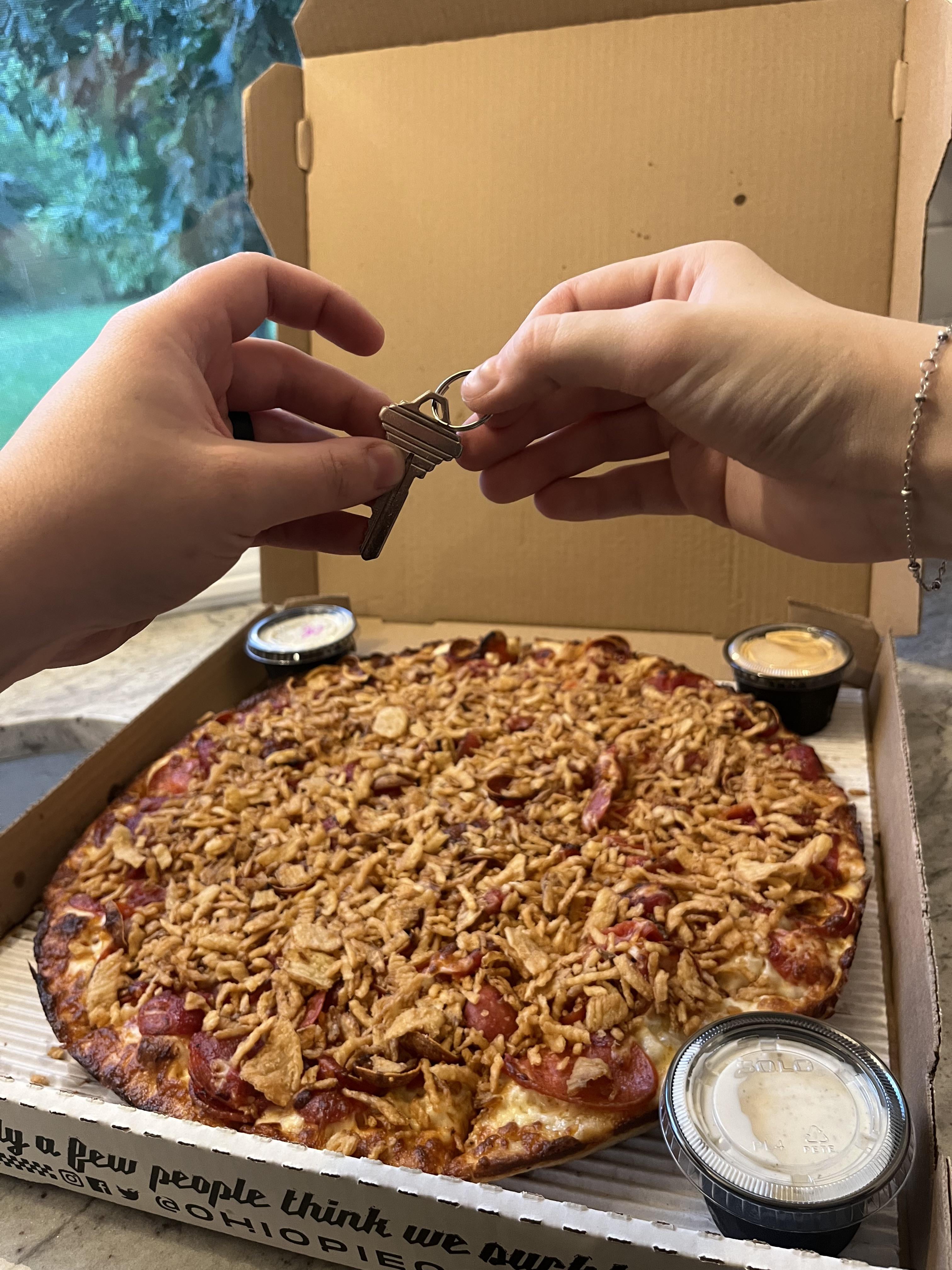 >It’s the best ever! It’s called the heart burner from Ohio Pie. Double pepperoni, garlic oil, & crispy onions. After sweating and moving stuff in it was literally a life saver.