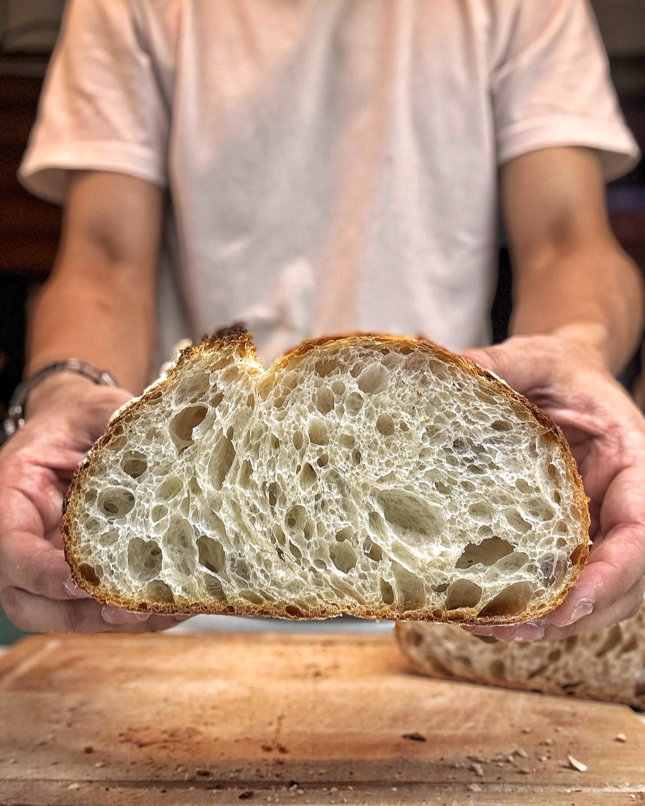However, to achieve that delicate, lacy crumb, these alveoli need to be balanced with proper fermentation. I push the bulk fermentation further than usual, targeting roughly a 70% rise in volume. Think of it like inflating numerous small balloons: to get a lacy effect, they must be properly filled with gas; otherwise, the crumb turns out denser, resembling sandwich bread. I preshape the dough very lightly and allow it to bench rest for 45-50 minutes. This relaxes the dough and helps elongate the alveoli. Finally, I shape with minimal tension and retard at 4°C for about 18 hours.