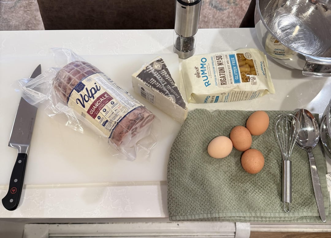 Ingredients: 4 egg yolks, about 6 ounces of guanciale, 12 ounces of pasta, about 2 tablespoons of peppercorns, about 6-8 ounces of pecorino Romano.