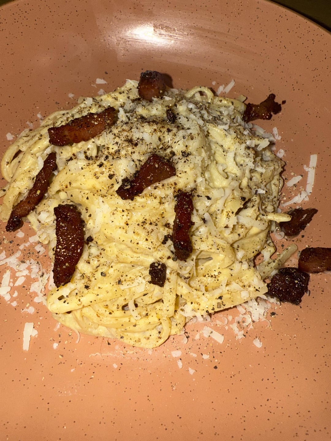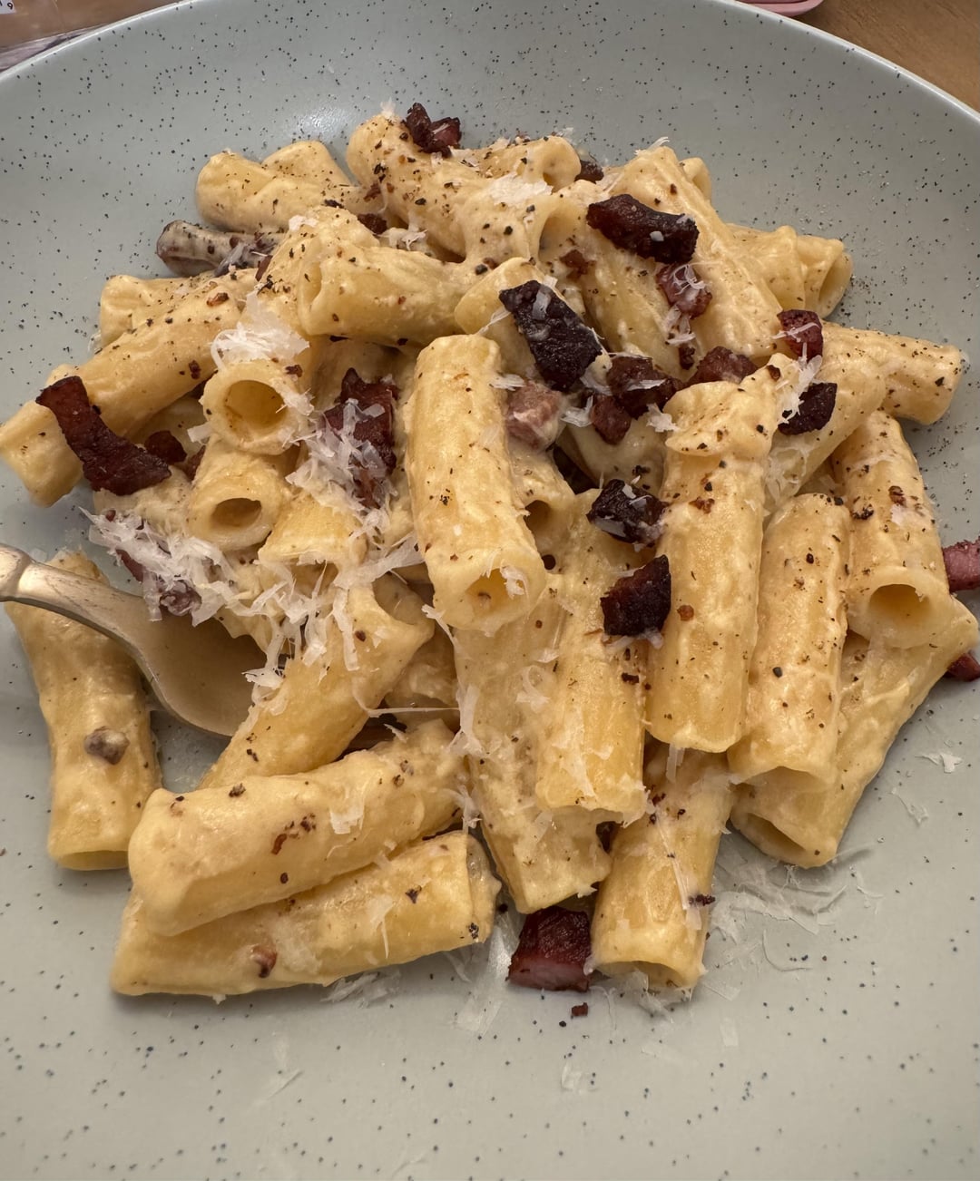 The last picture was my first attempt at carbonara, and the rigatoni is my second attempt. The first one, the sauce was a bit chunky because I didn't grate the cheese finely enough. They were both delicious. Does the rigatoni carbonara have a better appearance? I appreciate your critiques.