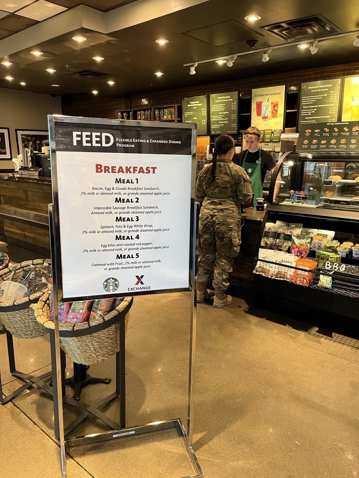 During the pilot, soldiers have a number of choices. Special menu items approved by food service experts and dietitians are available for purchase at restaurants such as Subway, Starbucks, Freshens, Qdoba and Burger King.