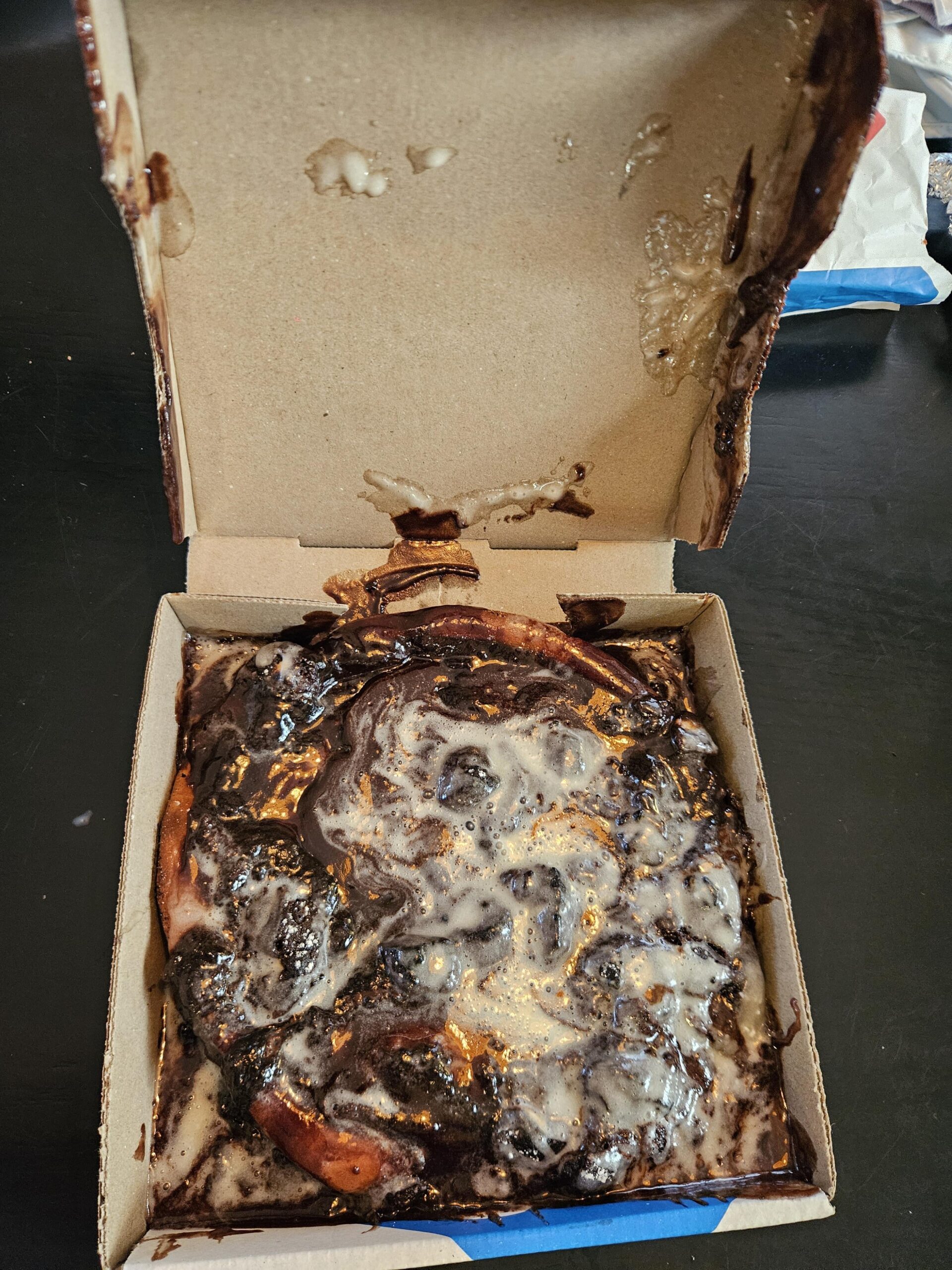So it looks like the ooey-gooey topping got smooshed all over the box. Possibly the dough was over-filled, or the crust wasn’t pulled up far enough. (A donut crust should make a pretty good wall against fluids sloshing around the box.) It also looks as though the dough was pulled too far out, because the pizza barely fits inside the box.