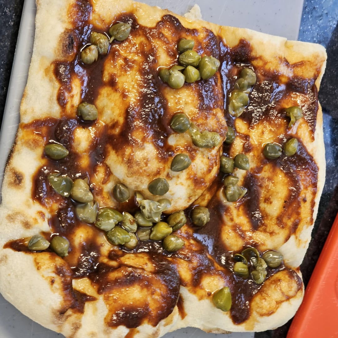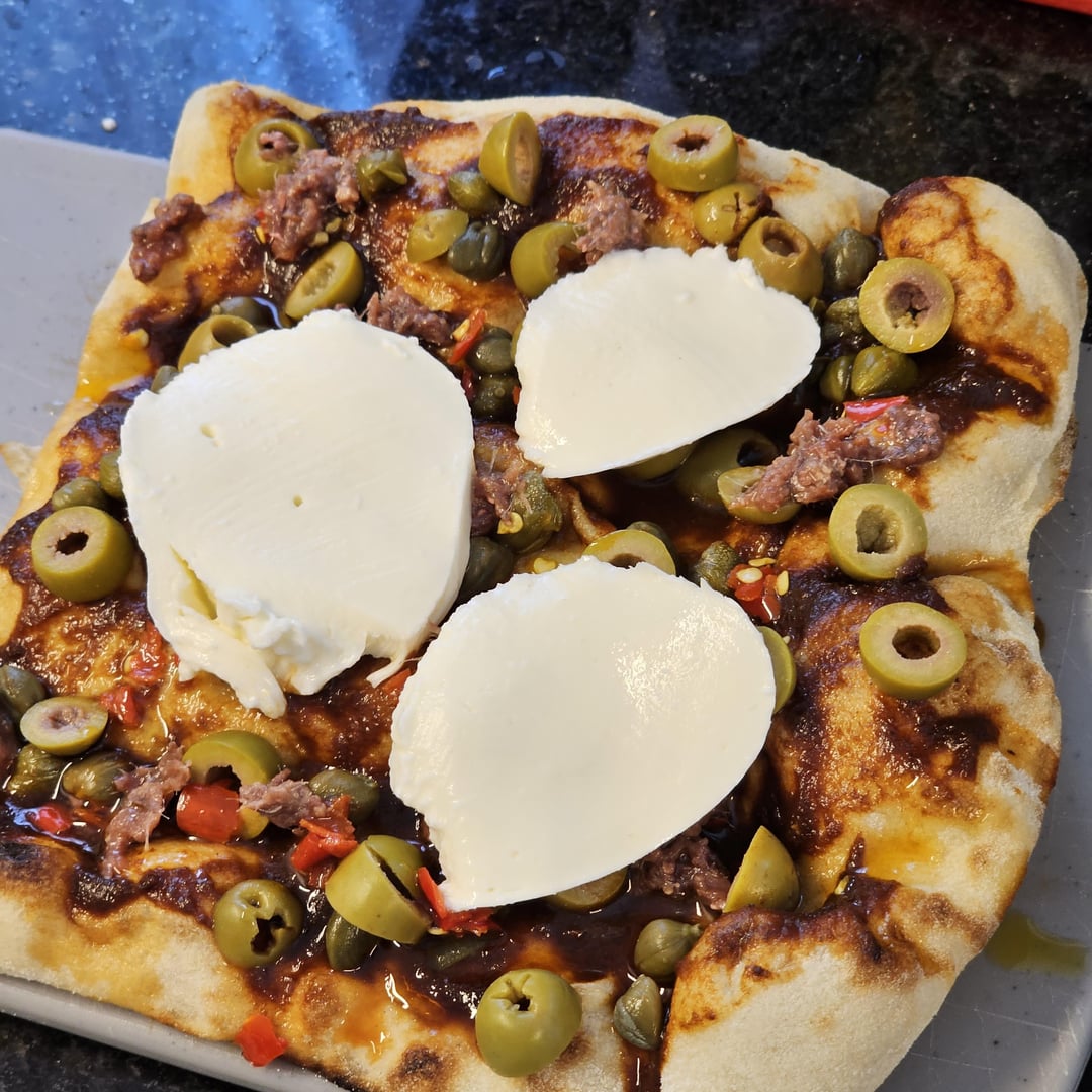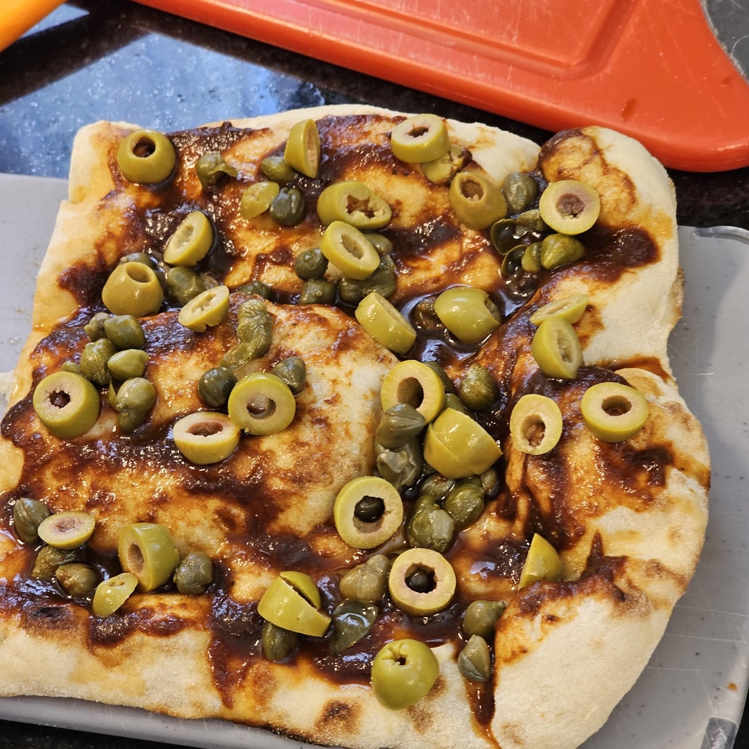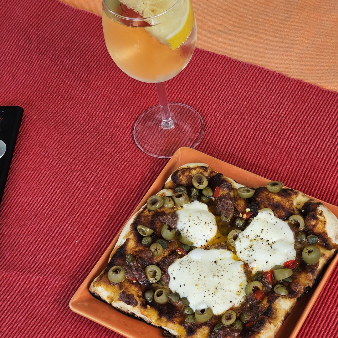 Pinsa fresh from the Grill (with tomato sauce from last harvest, capers, olives, anchovie fillets, chilies, mozzarella, olive oil, and black pepper), alongside a “Gschprützte Wiisse”