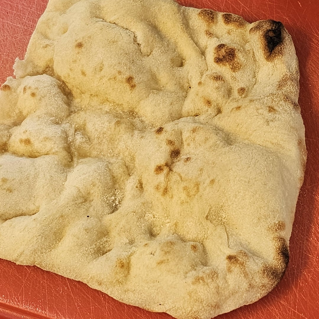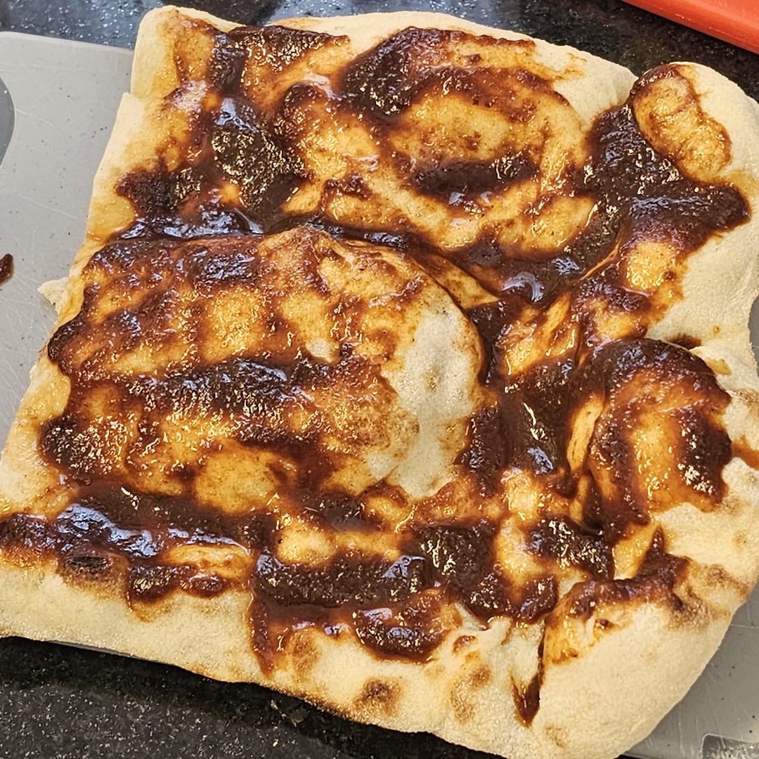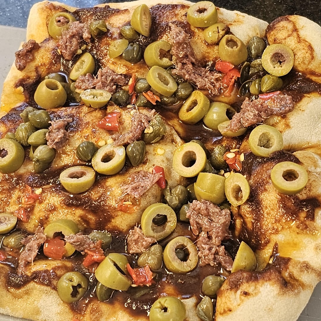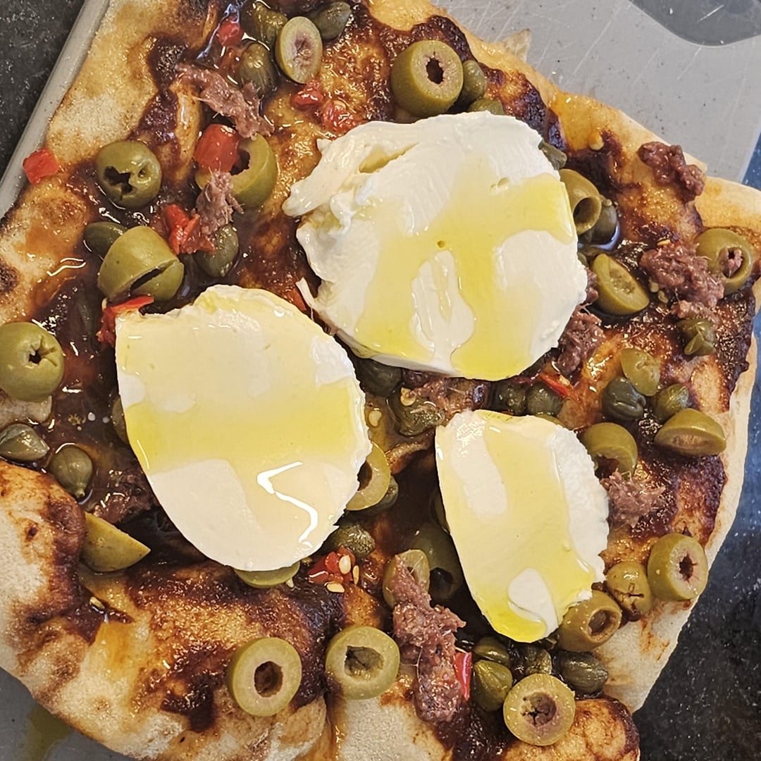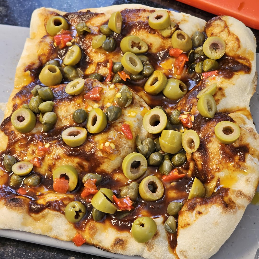Pinsa fresh from the Grill (with tomato sauce from last harvest, capers, olives, anchovie fillets, chilies, mozzarella, olive oil, and black pepper), alongside a “Gschprützte Wiisse”
