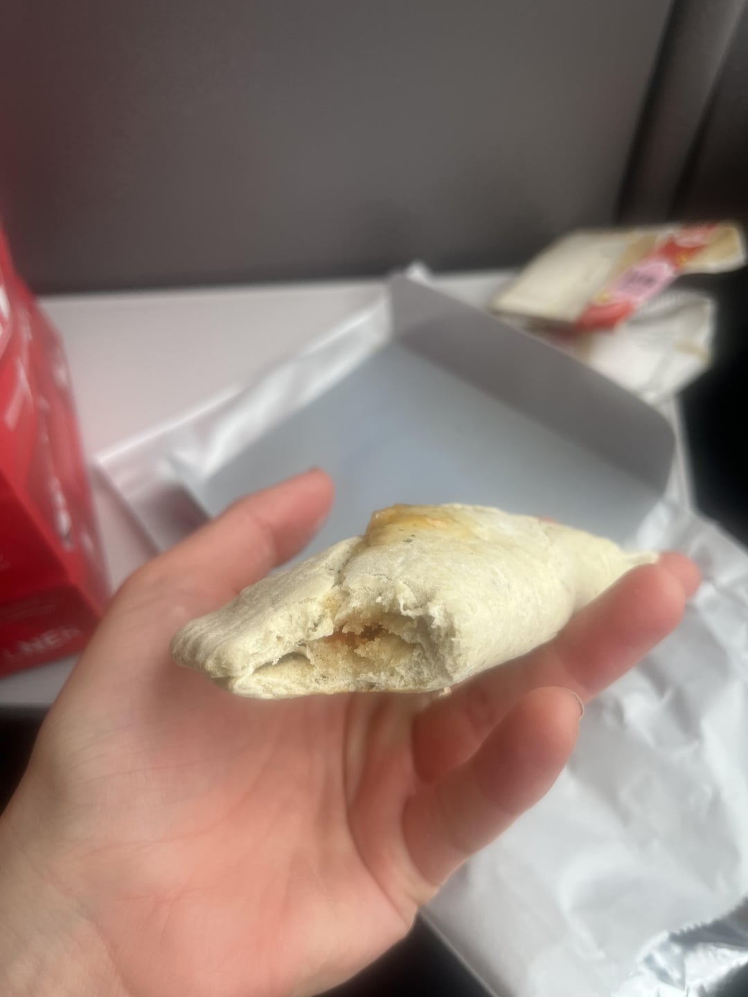 “Calzone pizza” I was just served. Yes, that dough tastes as raw as it looks, yes , I am still eating it, and yes, I am ashamed.