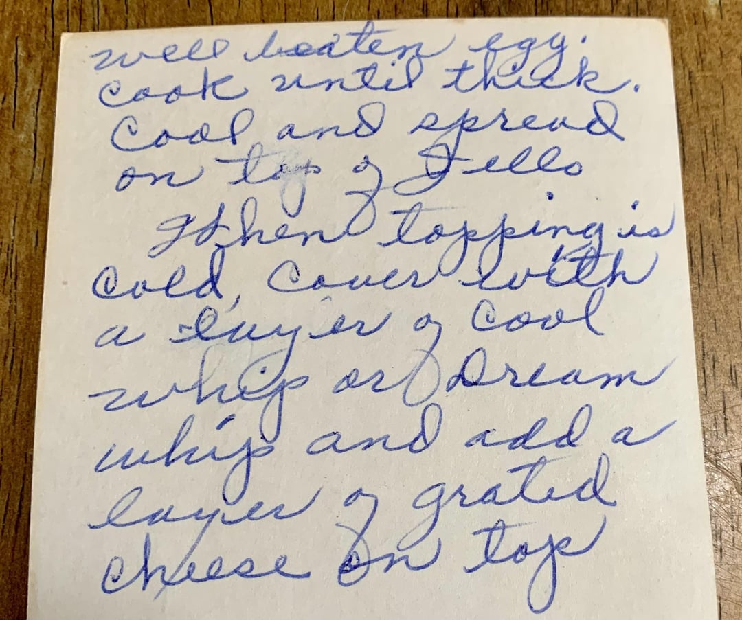 That looks exactly like my grandma’s recipe box layout and similar shaky cursive. I have no idea where it ended up when she died.