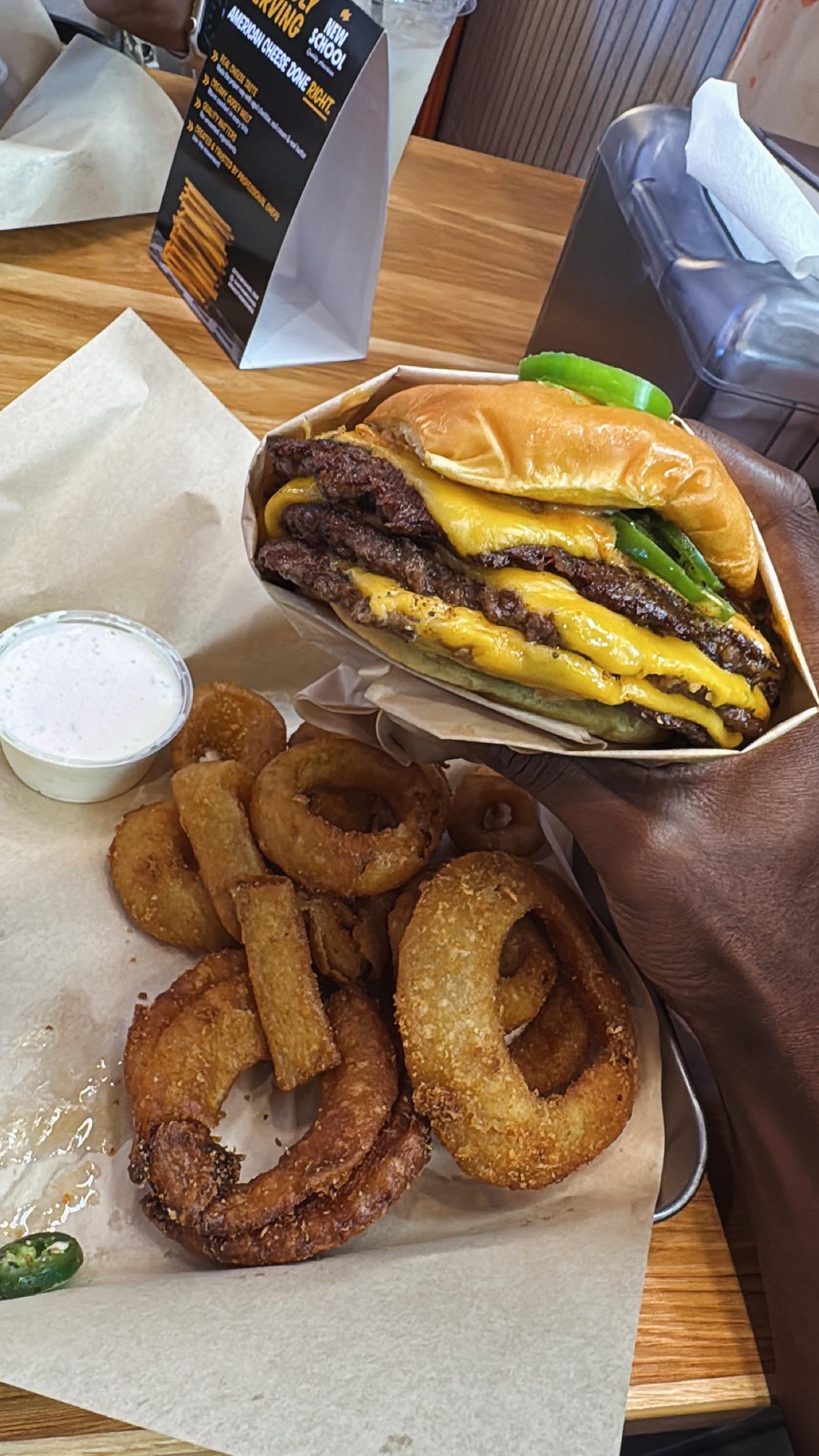 Triple smash with jalapeños paired with onion rings (fried in tallow). BOMBby jp_3 1 Comment Rubber_Chicken_Mann 2 months ago I went there for the first time yesterday. Lemme tell you, it was absolute FIRE.