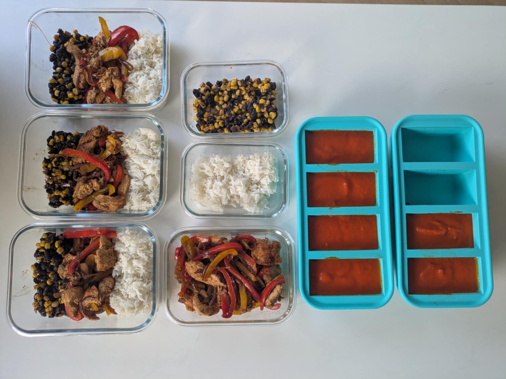 Fajita bowls for my boyfriend and ingredients for my wraps: Chicken marinated in cumin, paprika, cayenne pepper, oregano, salt, pepper. Red pepper, red onions, corn, black beans, rice. I will put this into a wrap along with some salad.
