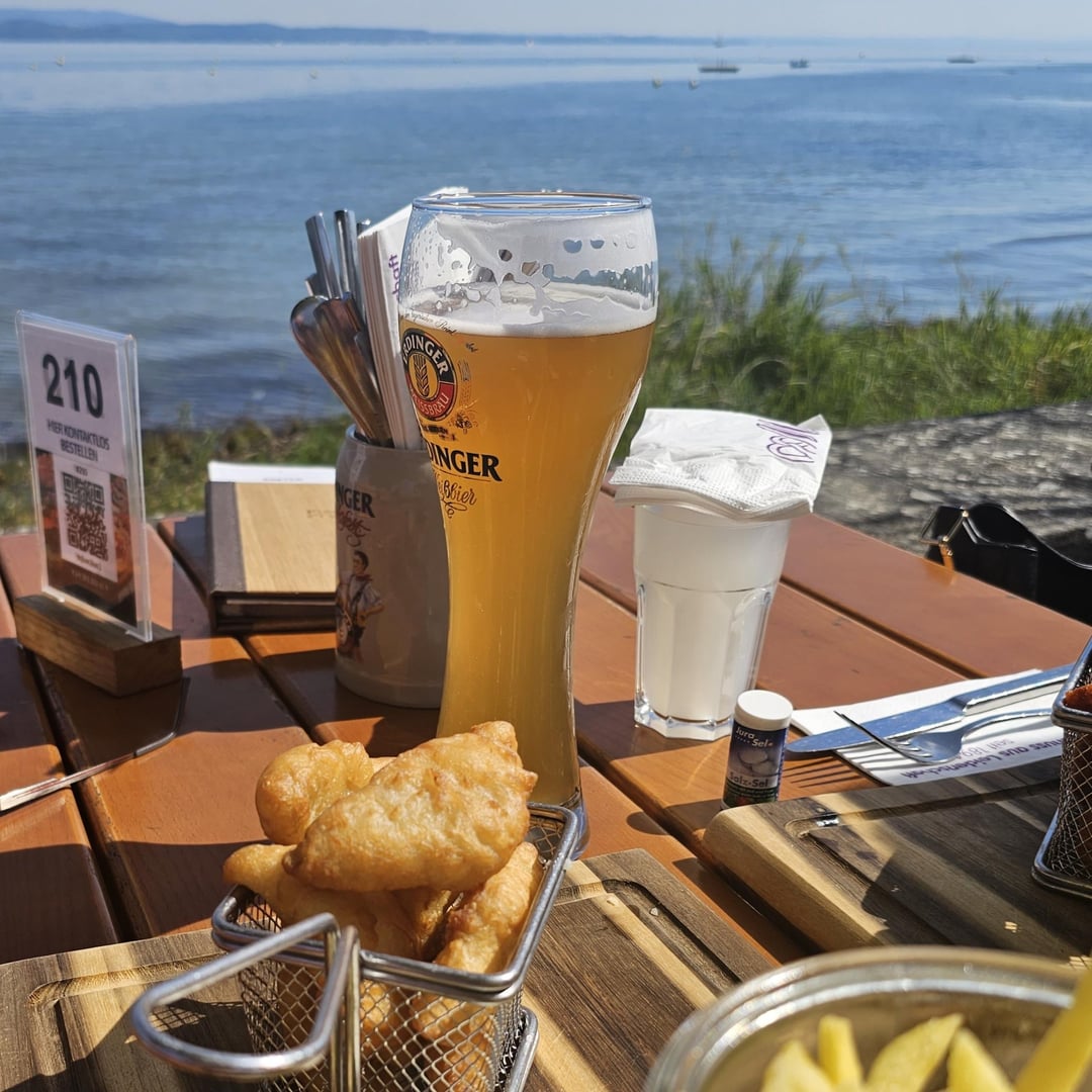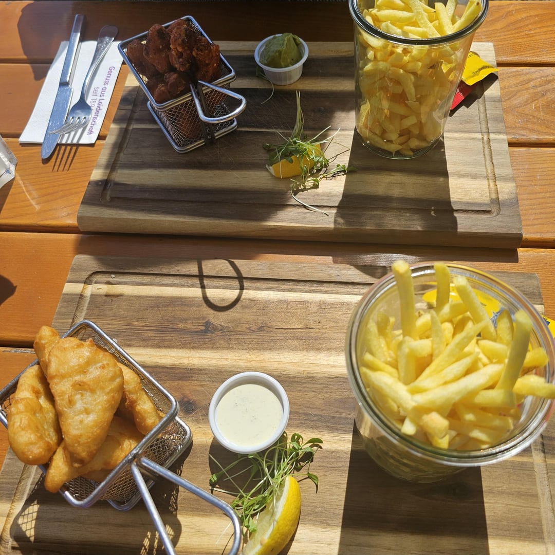 Zanderknusperli (fried zander nuggets) with tartar sauce, and Cauli Wings with guacamole sauce, in Kreuzlingen at Lake Constance, Switzerlandby Gulliveig Dining and Cooking