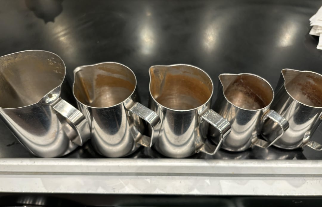 Everyone that’s working today is a first-time barista. We’ve all tried to scrub our pitchers in the past and nothing happened, so we assumed it was a natural tarnish that happened over time. Maybe even a patina. They were like this when we got here. But the disgust from everyone on our last post made us realize this is NOT normal. Even cafiza didn’t do anything, so we used a heavy duty pot and pan cleaner. They look like new. This will be a regular part of shop cleanup now. Thanks again, we never would have known!!!