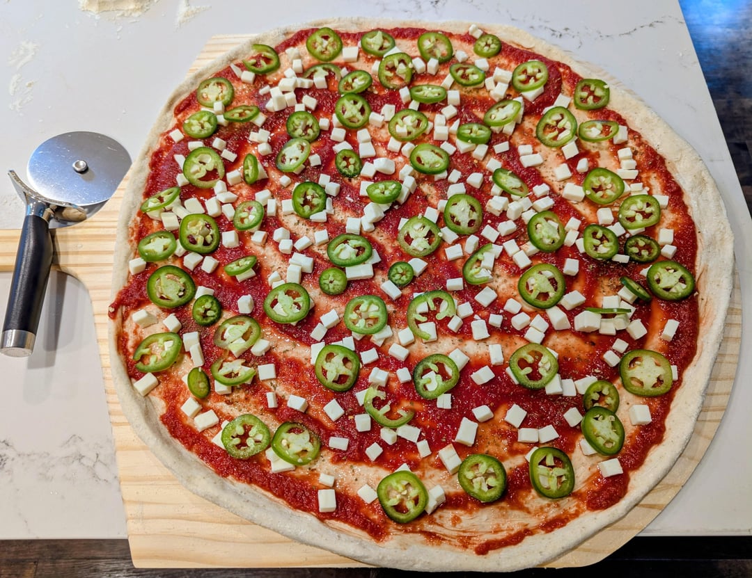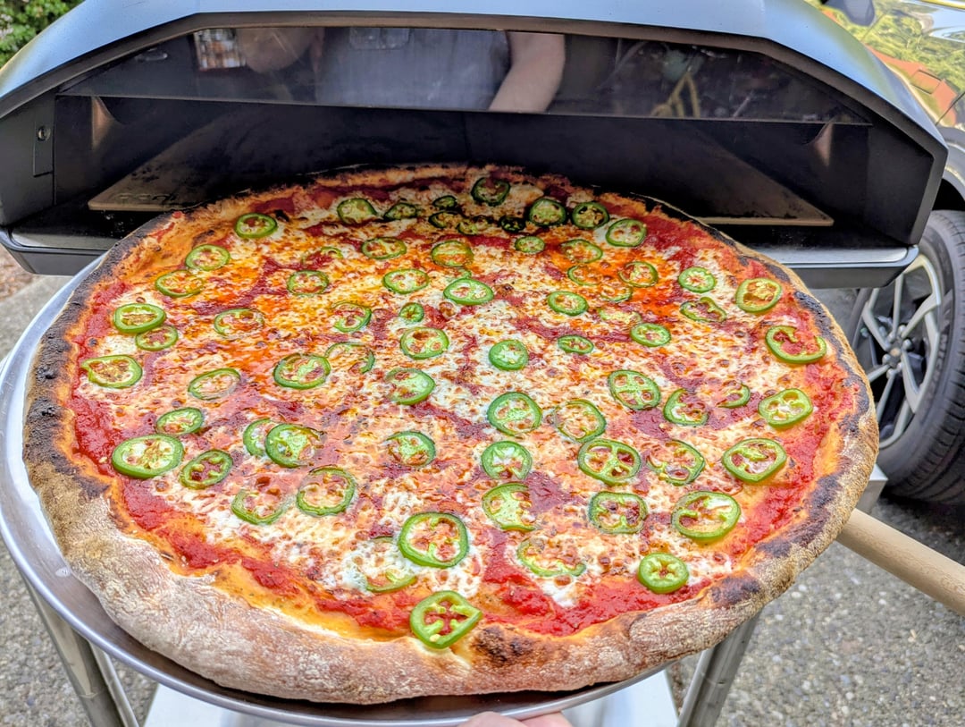 20" Jalapeno cheese in the Ooni Koda 2 Max. 62% hydration, 72 hour cold ferment. 280g cheese and 225g of sauce with an 800 gram dough ball.